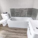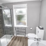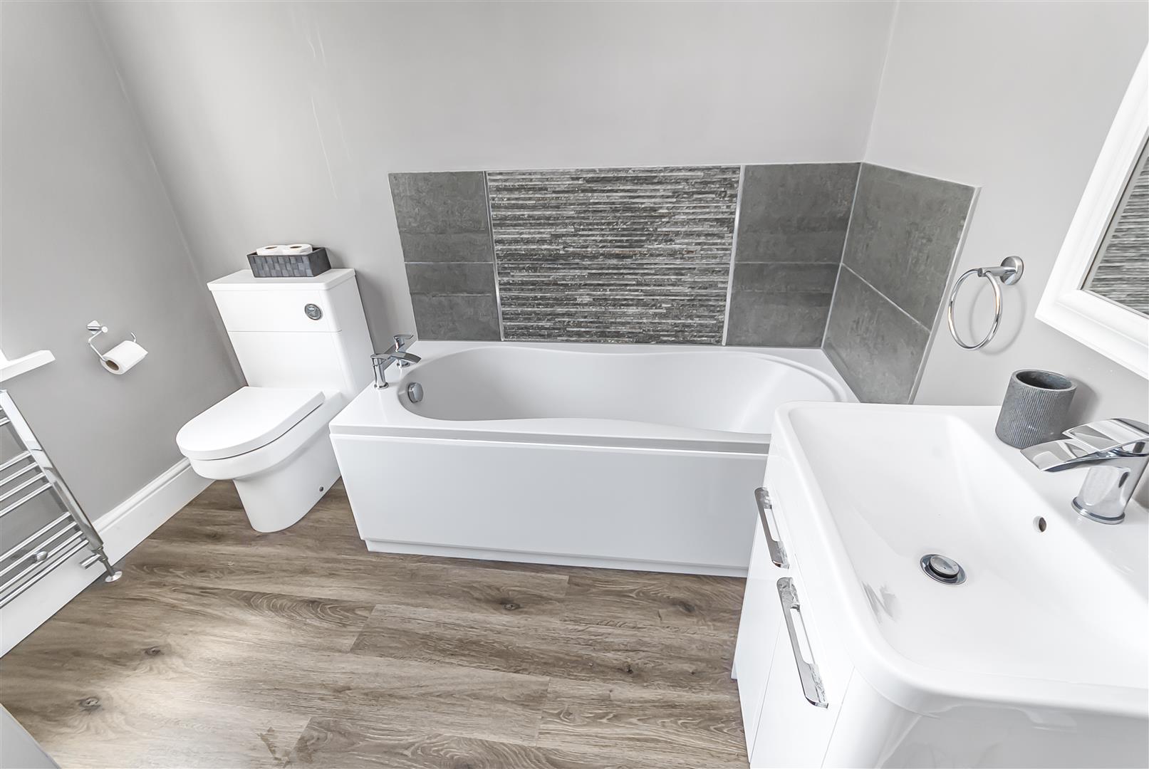 Partially tiled with wood effect flooring, extractor fan, four piece bathroom suite comprising of a panel enclosed bath, low flush WC, a hand wash basin with vanity and a walk-in shower with glass enclosure and a thermostatic controlled shower.