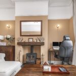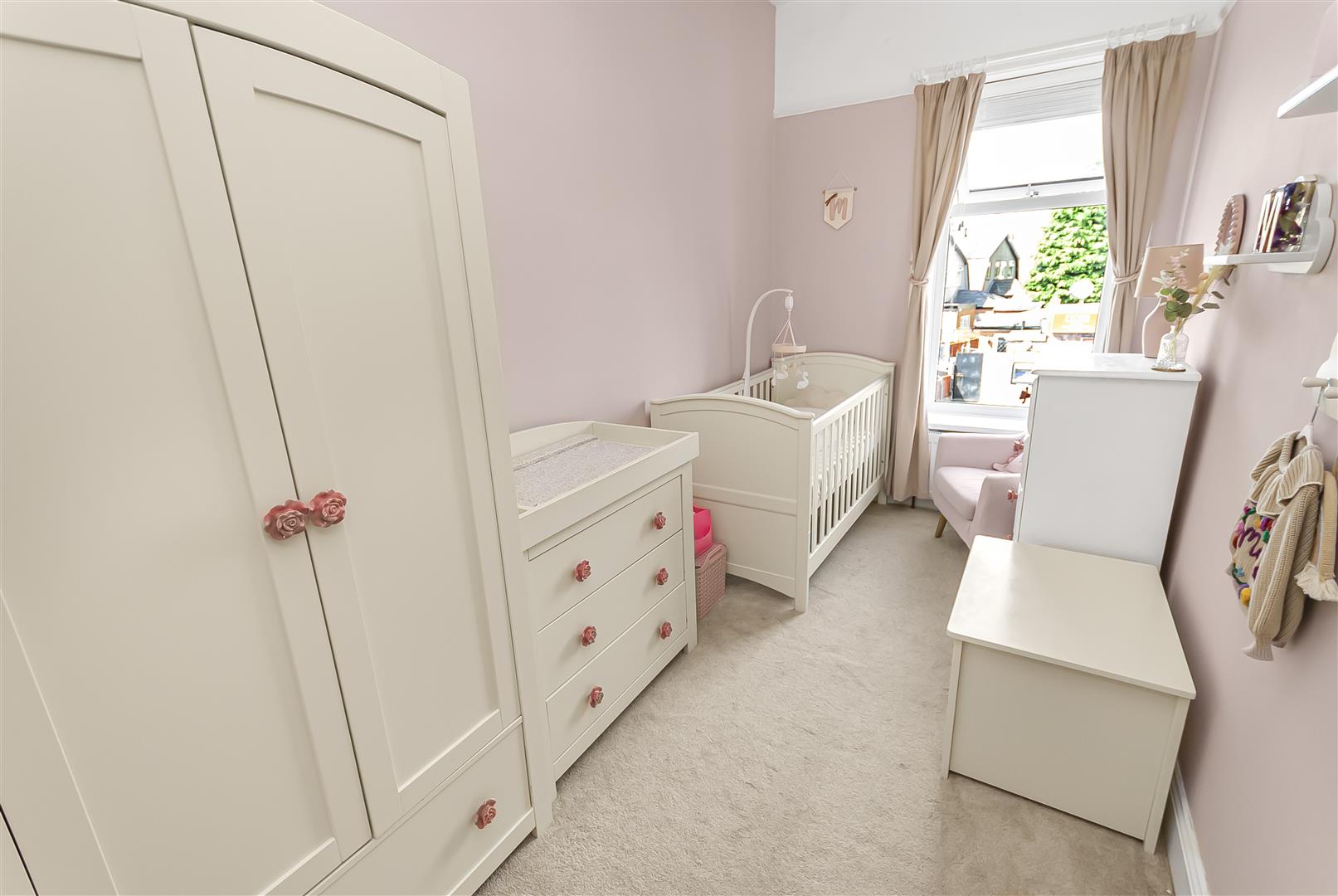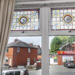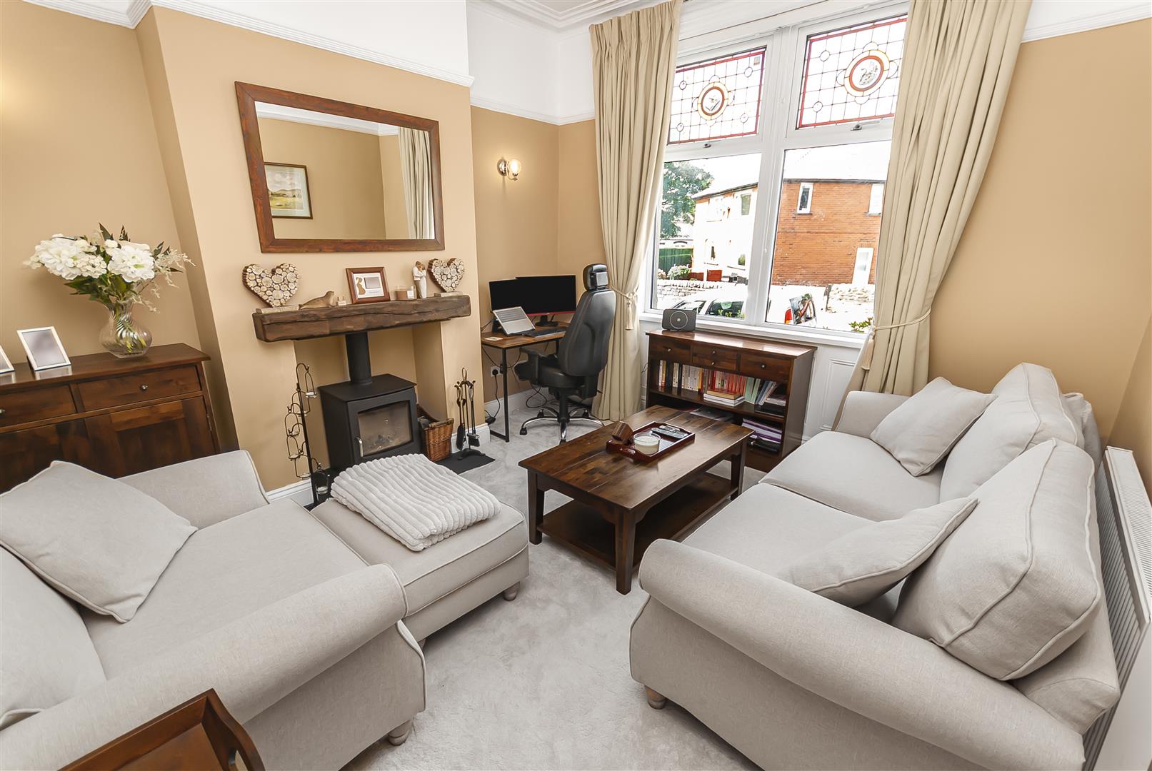 With a front facing uPVC window with stained glass top section, picture rail, coving and picture rail, radiator, power points, central ceiling light and wood burning stove with wooden beamed mantel