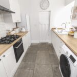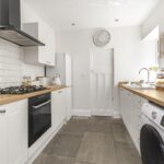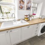 Stone flooring, fitted with a range of wall and base units with a contrasting wooden work tops, inset sink and drainer with a mixer tap, space for an oven and hob with extractor fan above, plumbing a washing machine, space for a fridge freezer, central ceiling spot lights and to the downstairs WC.