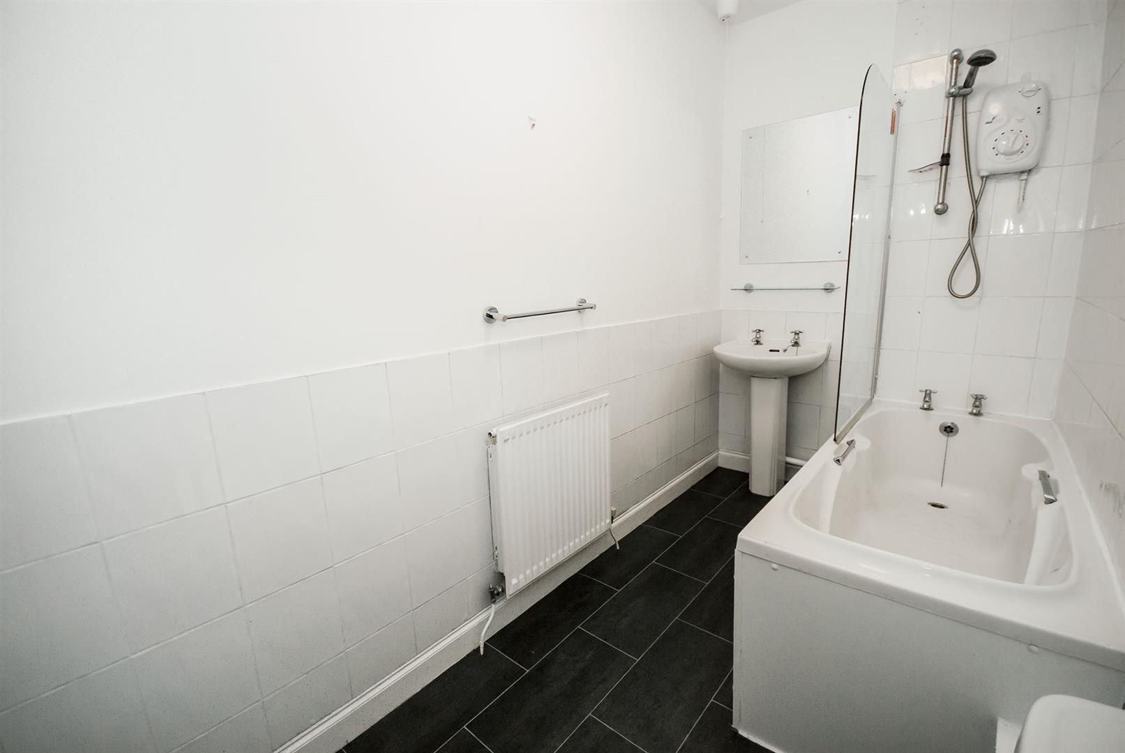 Partly tiled with a radiator, extractor fan, three suite bathroom suite comprising panel enclosed bath with electric shower over and screen, low flush WC and hand wash basin with pedestal.