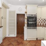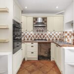 Double glazed window to rear elevation, with access to rear, fitted with a range of country style wall and base units with contrasting worktops, inset one and half sink with mixer tap, splash back tiles, five ring gas hob with extractor above, integrated oven and grill, space for fridge and freezer, space for washing machine, tiled flooring, inset spots, storage cupboard, floor to ceiling radiator.