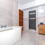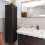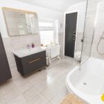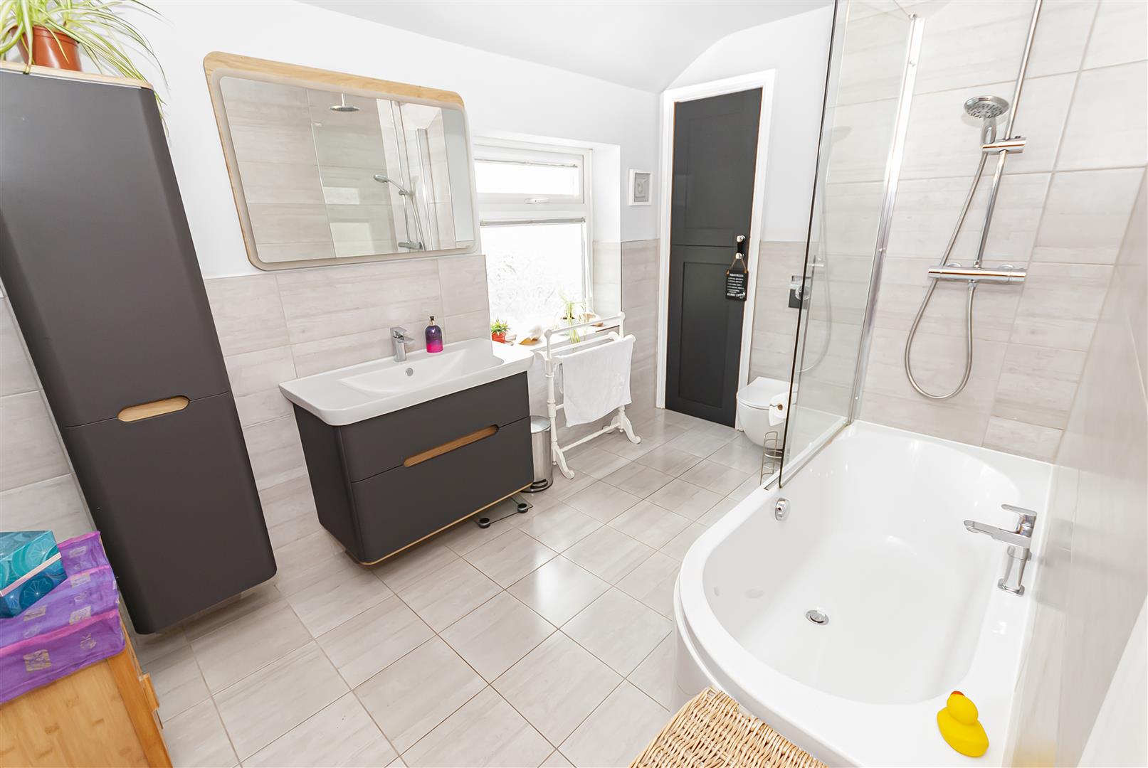 A modern and stylish bathroom fitted with a contemporary suite including bath with shower over, wash hand basin and WC, complemented by modern tiling and fittings.
