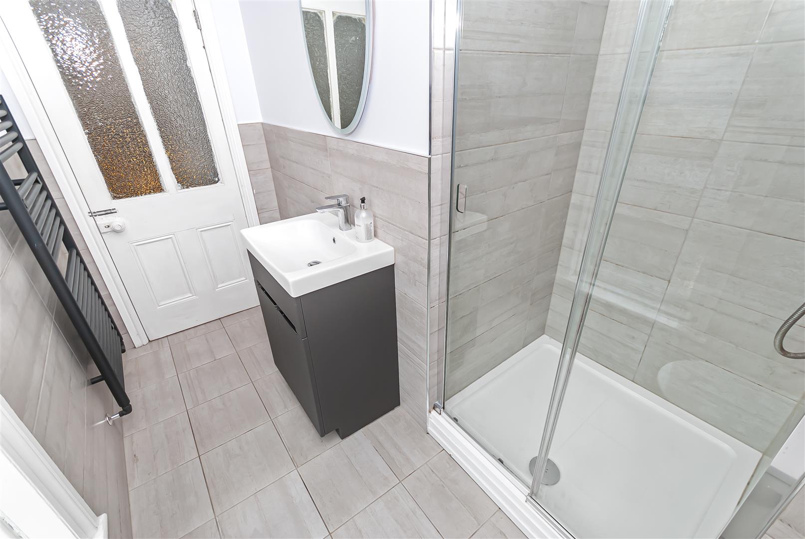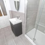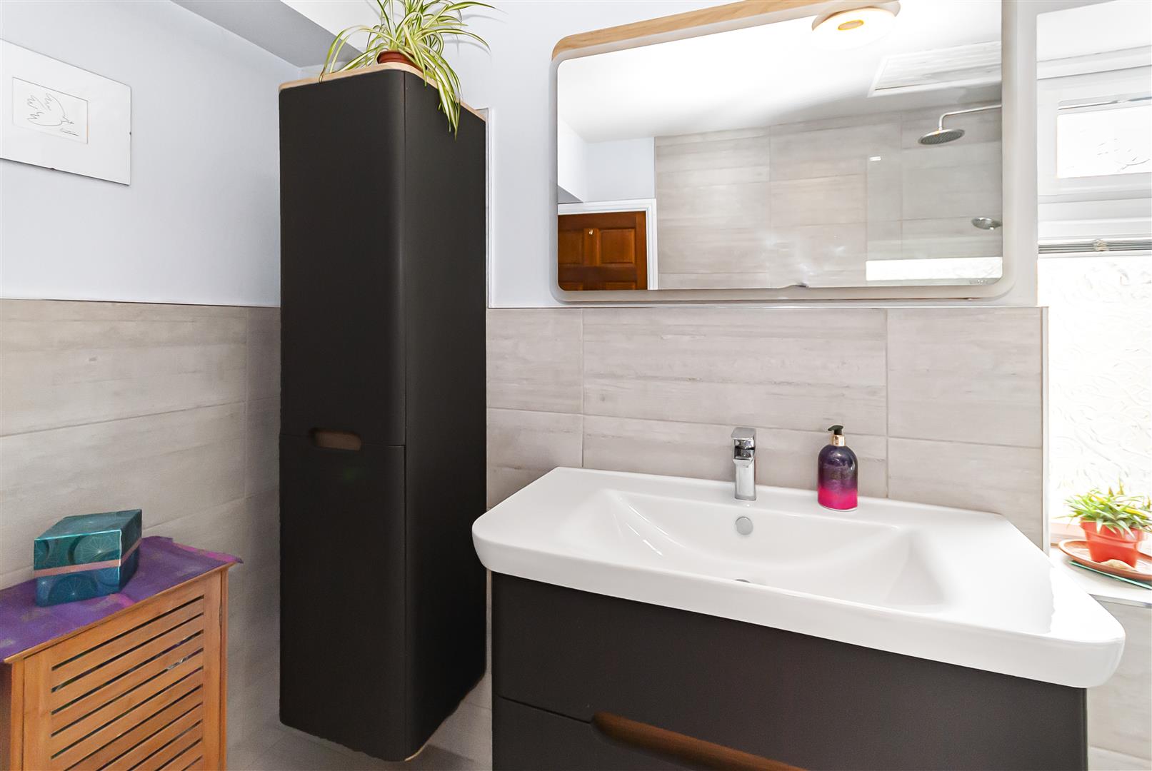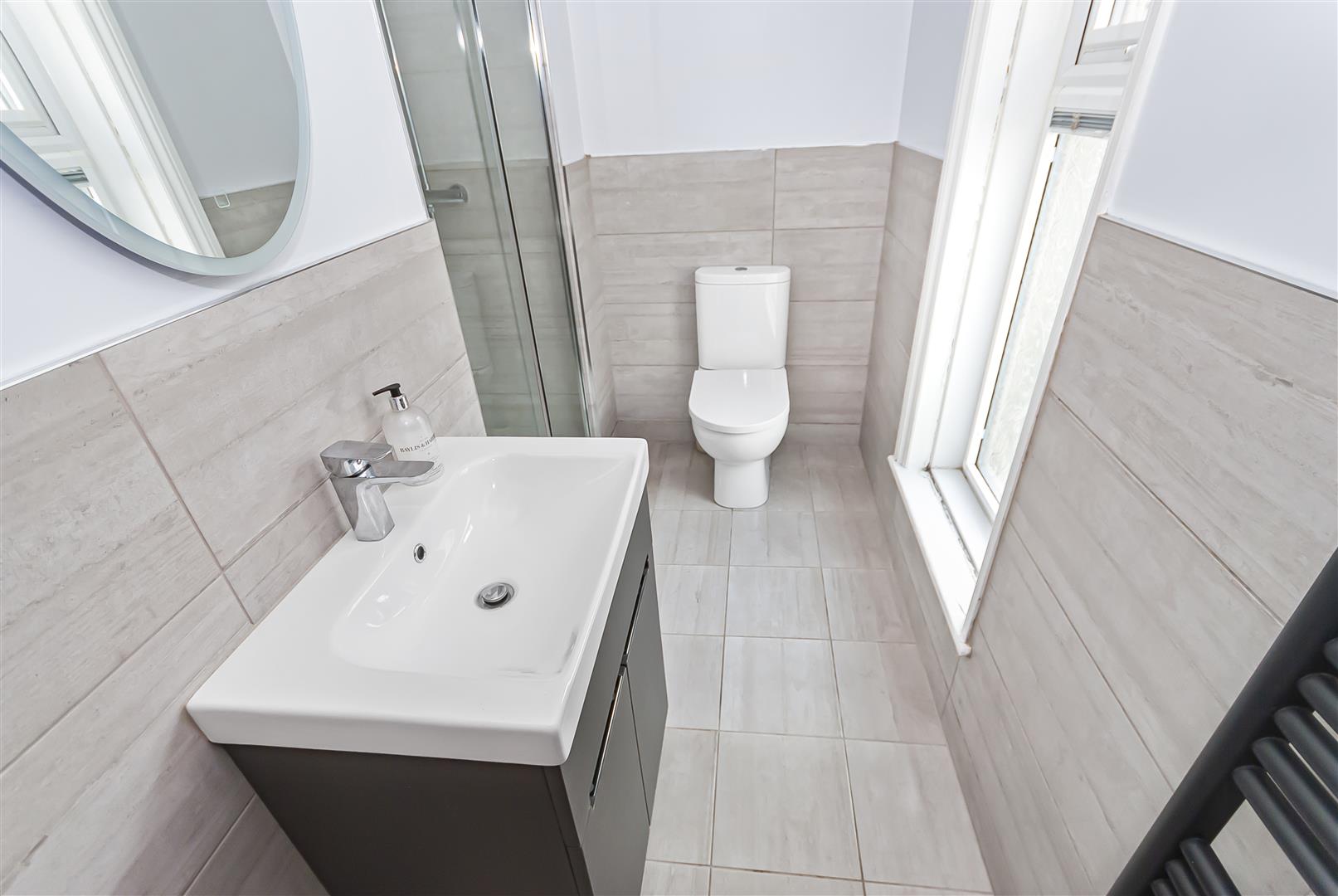 Fitted with a three piece bathroom, including walk in shower, wash hand basin with vanity unit and WC, complemented by modern tiling and fittings.