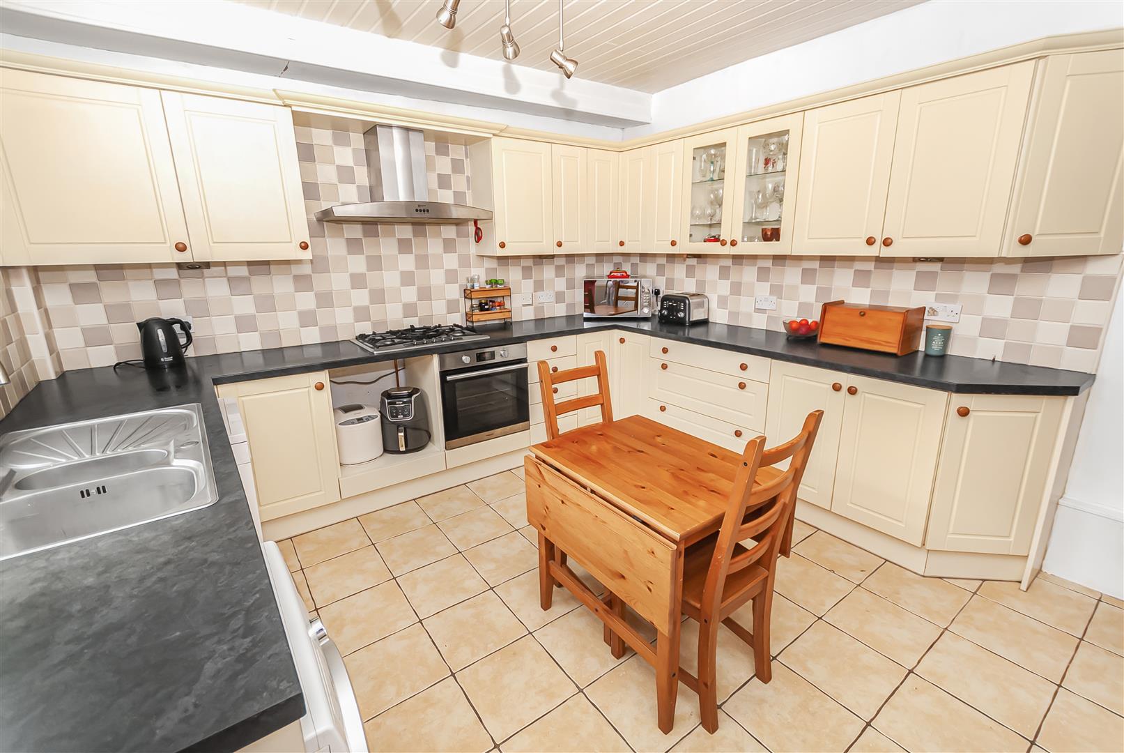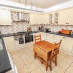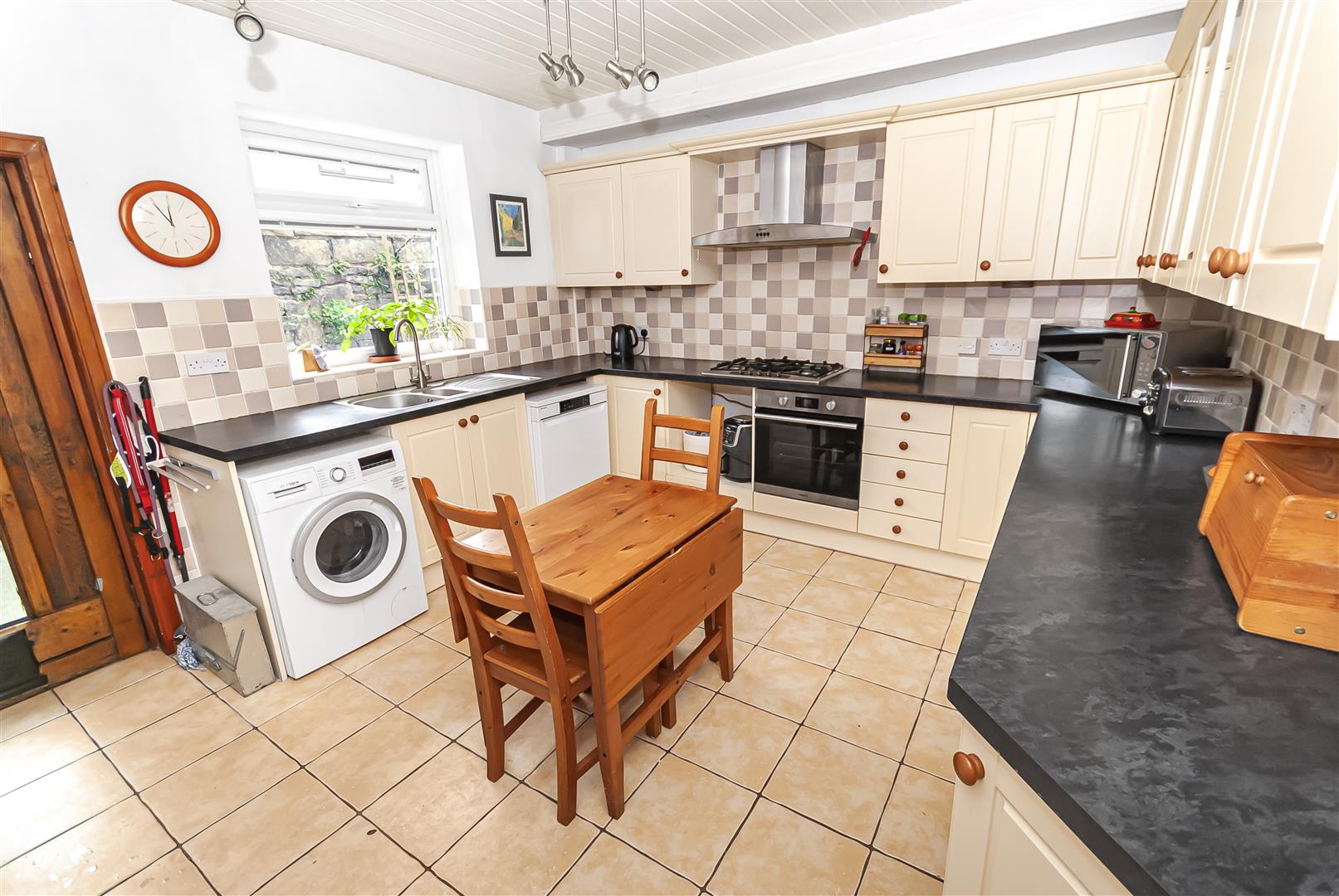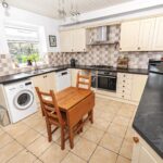 A well-proportioned kitchen fitted with a range of wall and base units, complementary work surfaces and integrated appliances, with space for a dining table and access to the rear courtyard.