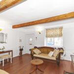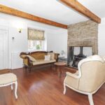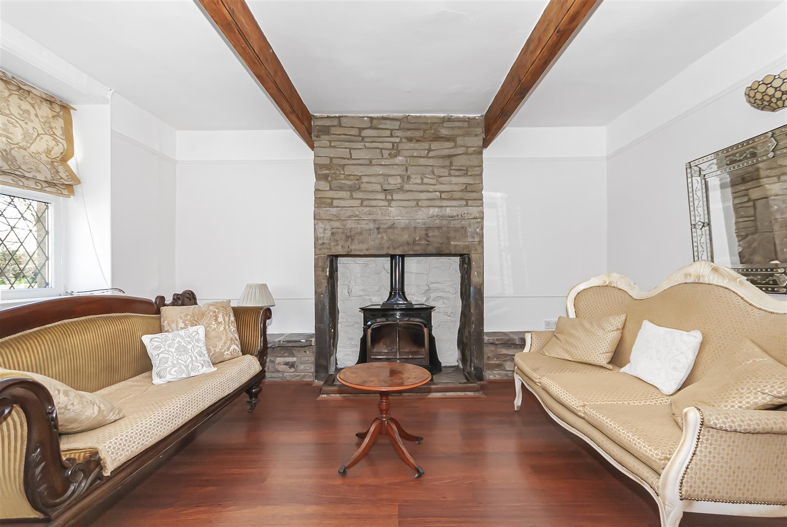 A characterful and spacious reception room featuring exposed ceiling beams and a striking stone fireplace housing a multi fuel stove, creating a warm focal point to the room. The space offers plenty of room for lounge furniture and enjoys natural light from the front-facing window, while wooden flooring adds warmth and complements the cottage-style character of the property.