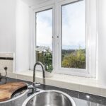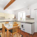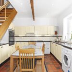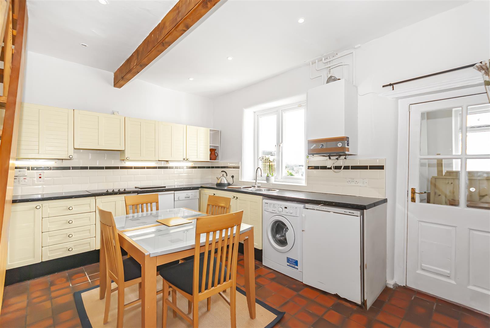 A generous dining kitchen fitted with a range of wall and base units with complementary work surfaces and tiled splashbacks. The room comfortably accommodates a dining table, making it ideal for everyday family living or entertaining. Exposed beams and a feature staircase rising to the first floor add further character, while windows and a rear door allow plenty of natural light and access to the outside space.