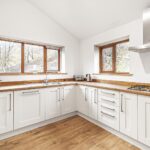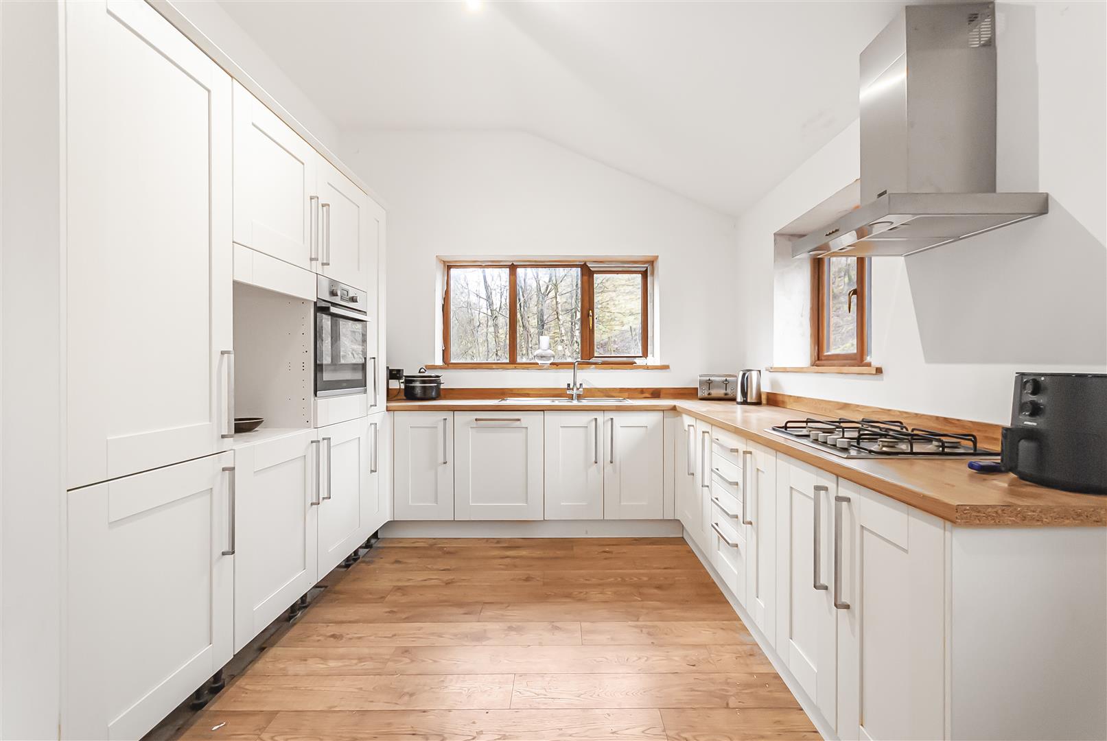 A modern and well-appointed kitchen fitted with contemporary cabinetry, wooden work surfaces and integrated appliances including hob with extractor, oven and sink with mixer tap. Ample space for dining table and chairs makes this an excellent entertaining and family space.