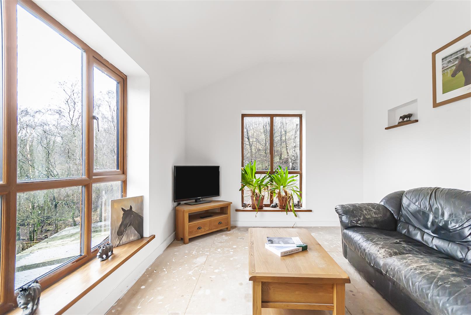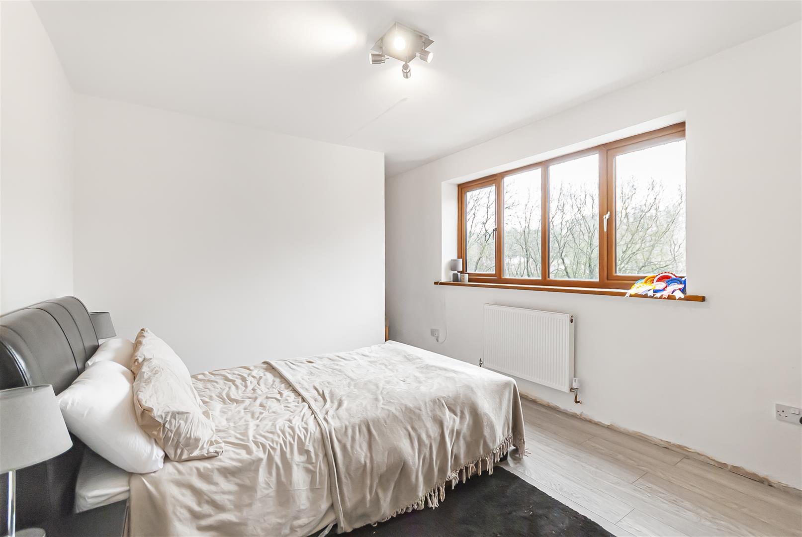 A well-proportioned double bedroom enjoying woodland aspects through large windows, offering a bright and comfortable space.