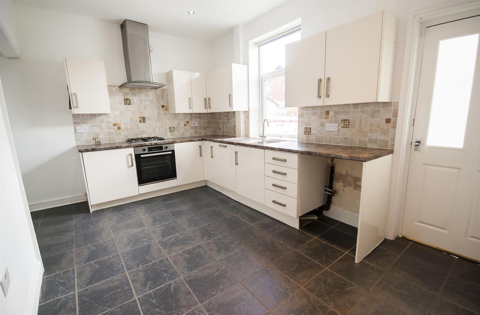 With a rear facing UPVC window, spotlighting, tiled flooring, radiator and power points, fitted with a range of wall and base units with contrasting work surfaces, inset sink and drainer unit, built in electric oven with gas hob and extractor hood, plumbing for a washing machine and space for a fridge freezer. UPVC door opens to the rear porch.
