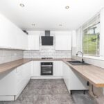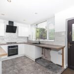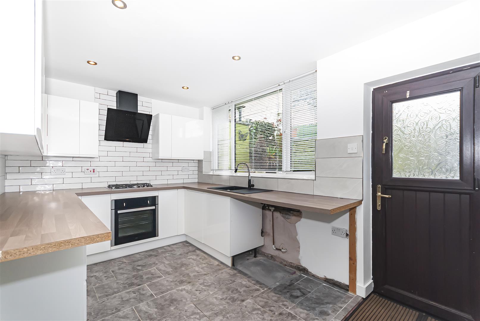 Fitted with a range of wall and base units with a contrasting work surface. inset sink with drainer, tiled flooring, part-tiled walls, and plumbing for both a washing machine and dishwasher. Also benefits from ceiling spotlights, a UPVC double glazed rear window, and a back door leading to the rear yard.