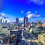 Aluminium framed floor to ceiling window with views over Manchester city centre, electric heater and inset ceiling spot lights.