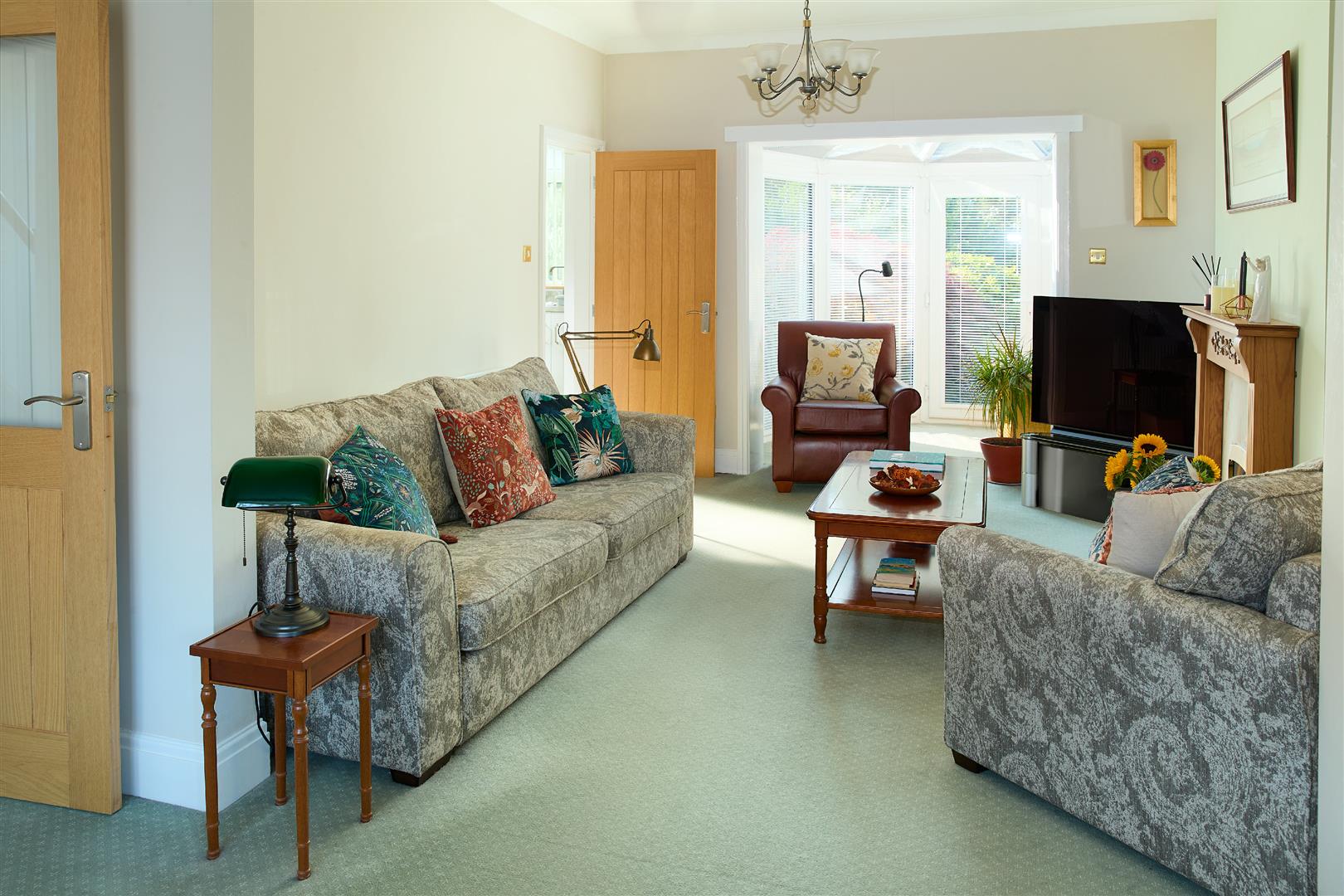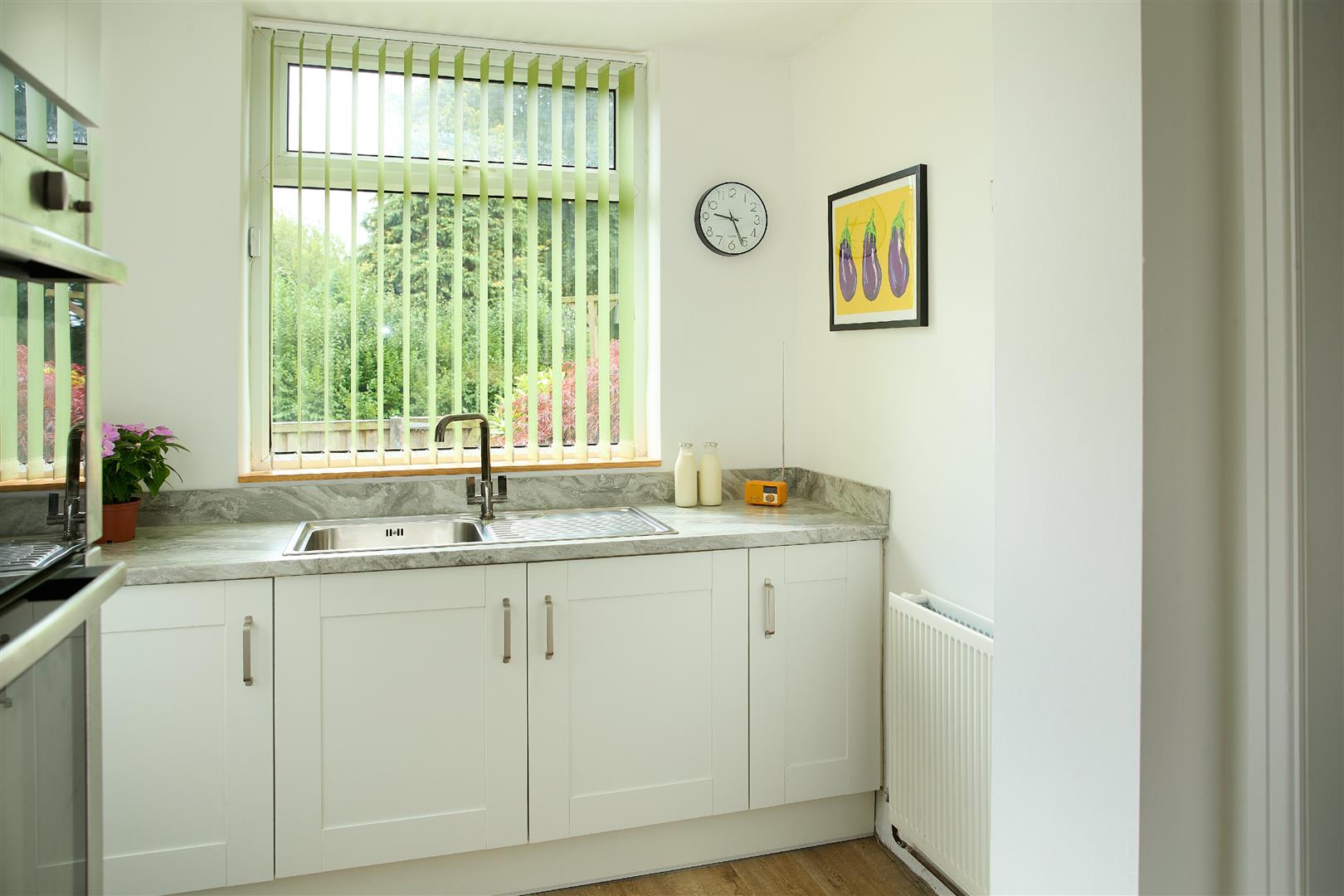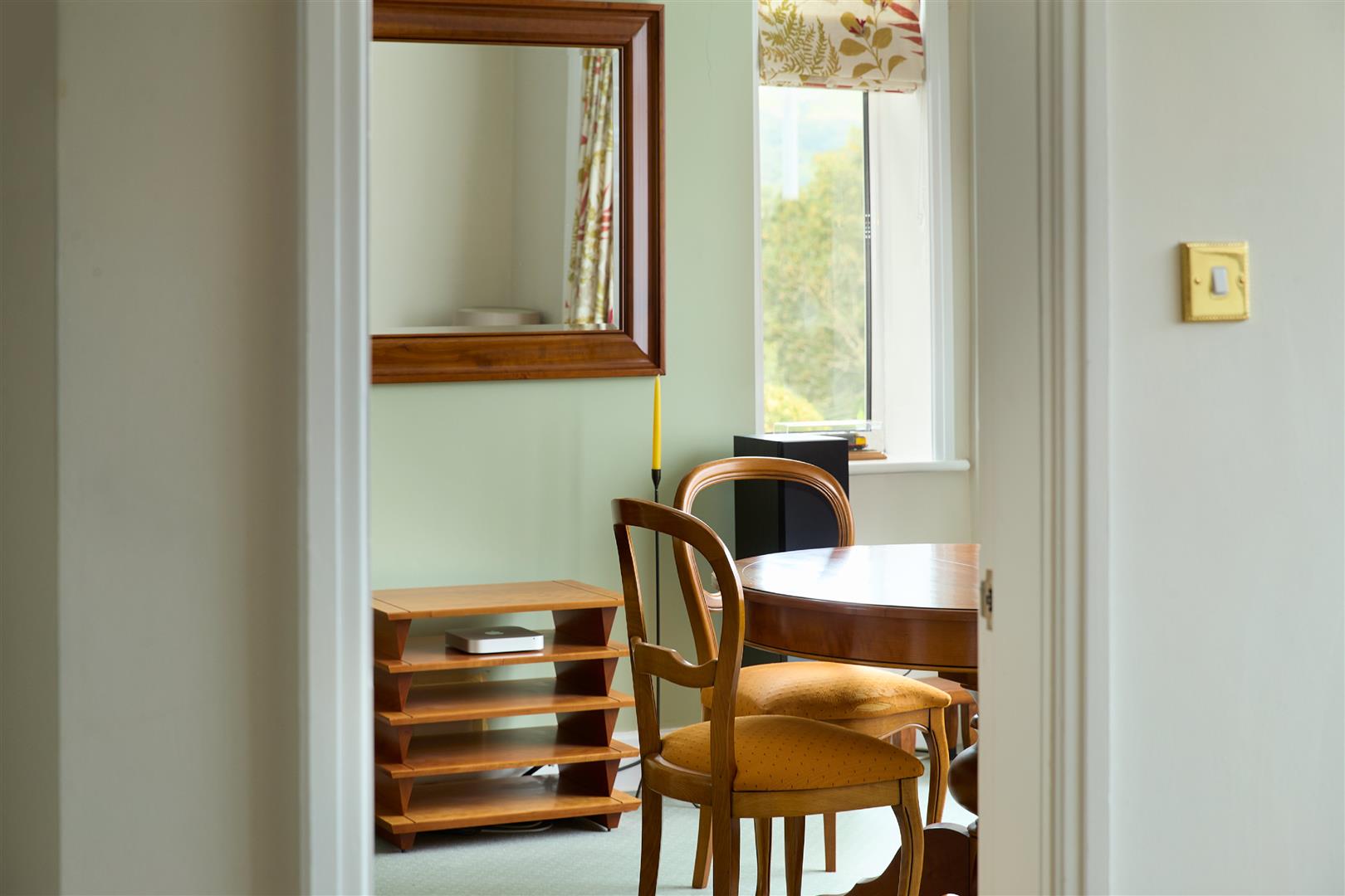 Double glazed windows with views overlooking well maintained garden, door leading out in to garden with fitted blinds, wall lights and gas central heating radiator.