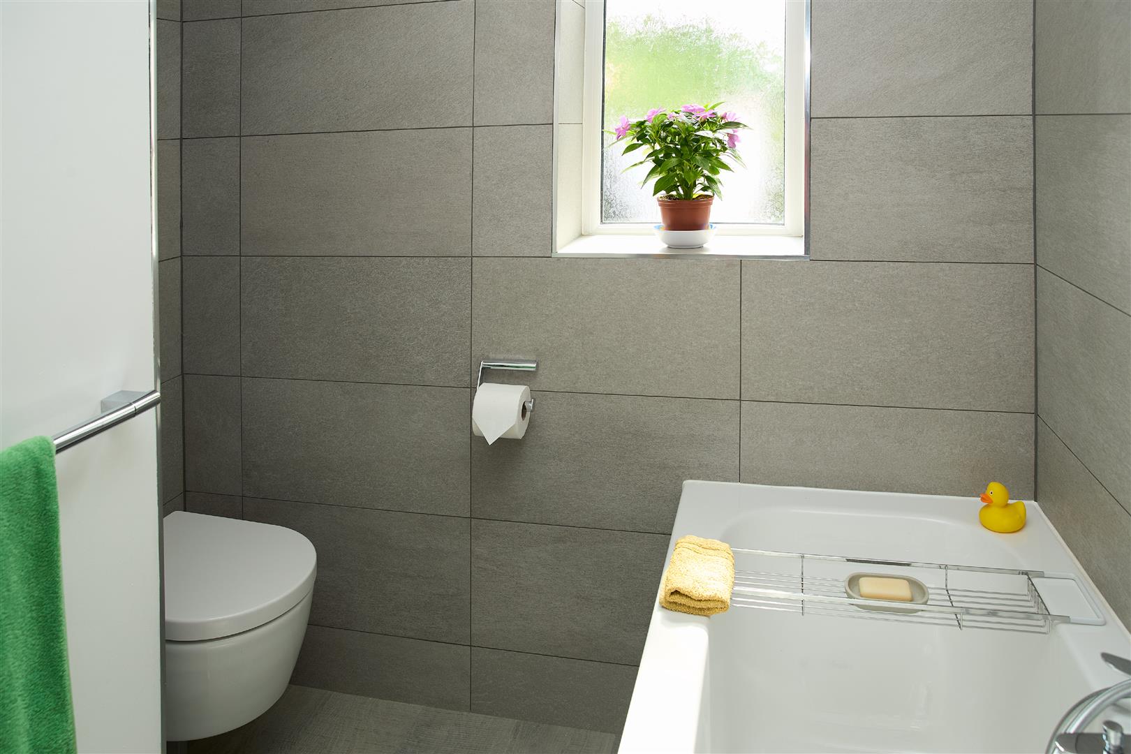 Double glazed frosted window to rear elevation, fitted with a modern three piece suite, comprising of low level wc, hand wash basin with vanity unit, panelled bath with shower, fully tiled walls, laminate wood flooring, inset spots and gas central heating radiator.