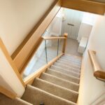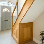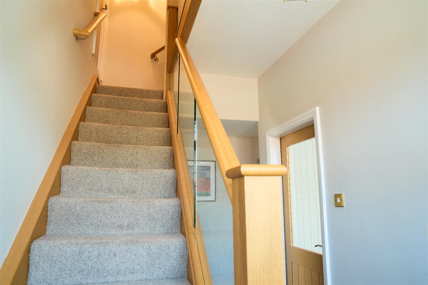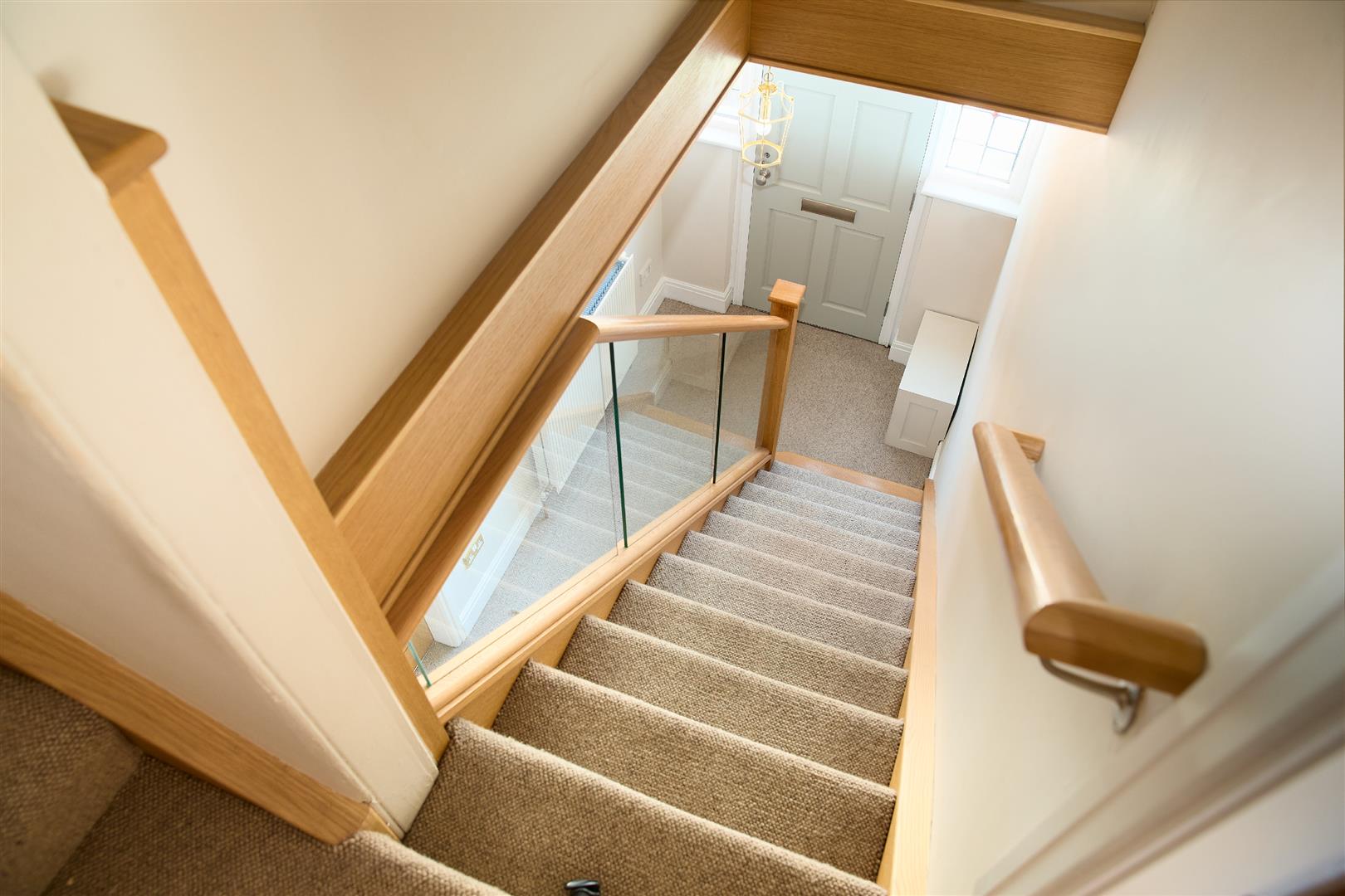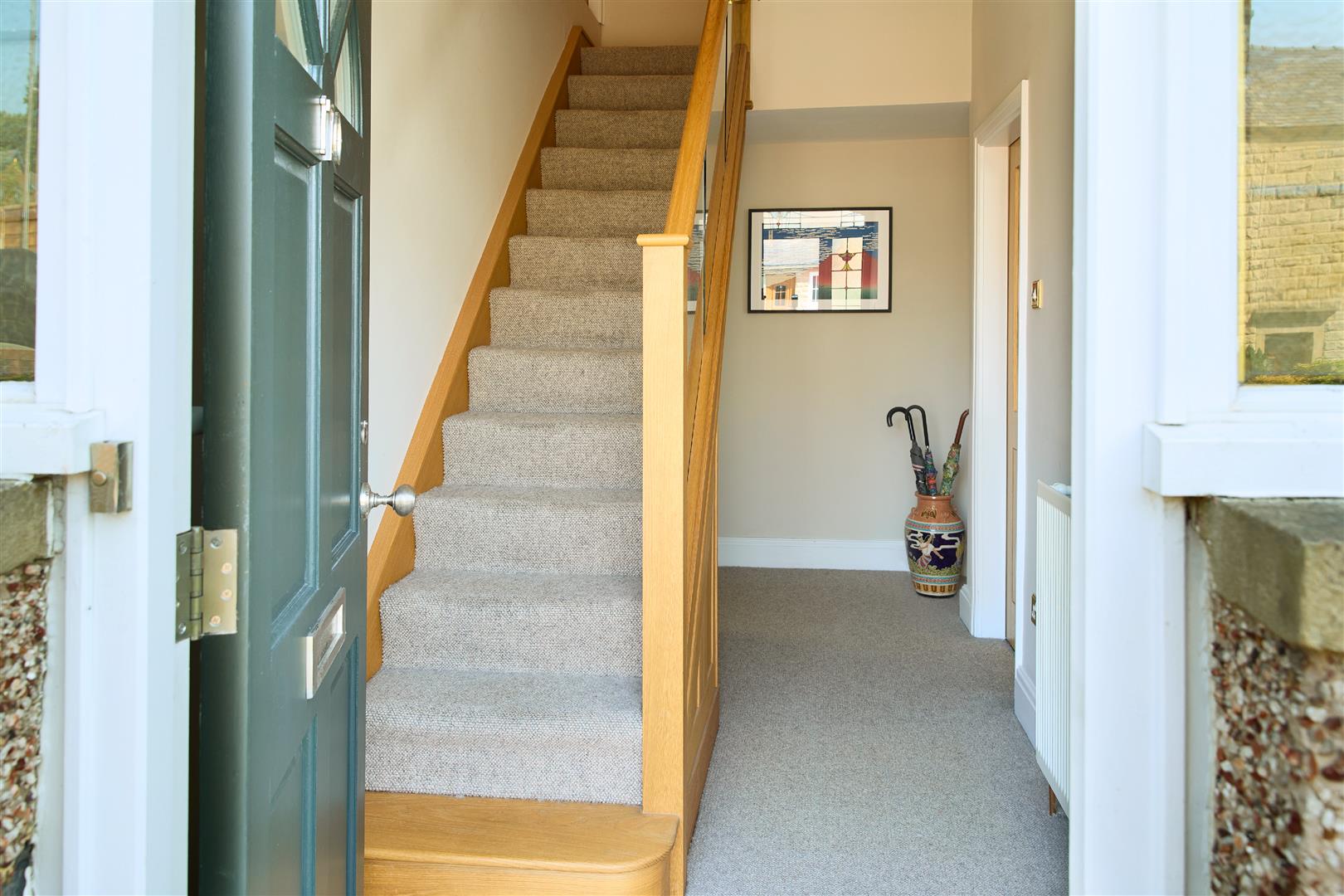 Door to front elevation with glass lead windows, stairs leading to third bedroom/home office and storage space, access to downstairs accommodation, centre ceiling light and gas central heating radiator