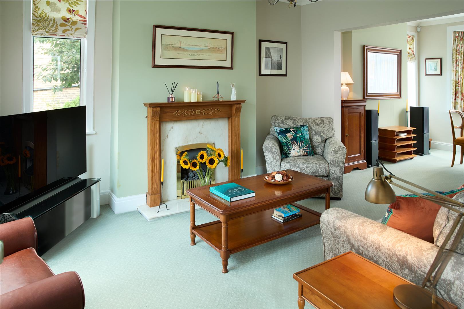 Double glazed window to side elevation, fitted with a gas coal fireplace with marble hearth and wood surround, coving, centre ceiling light and gas central heating radiator, access through to conservatory with views over rear garden