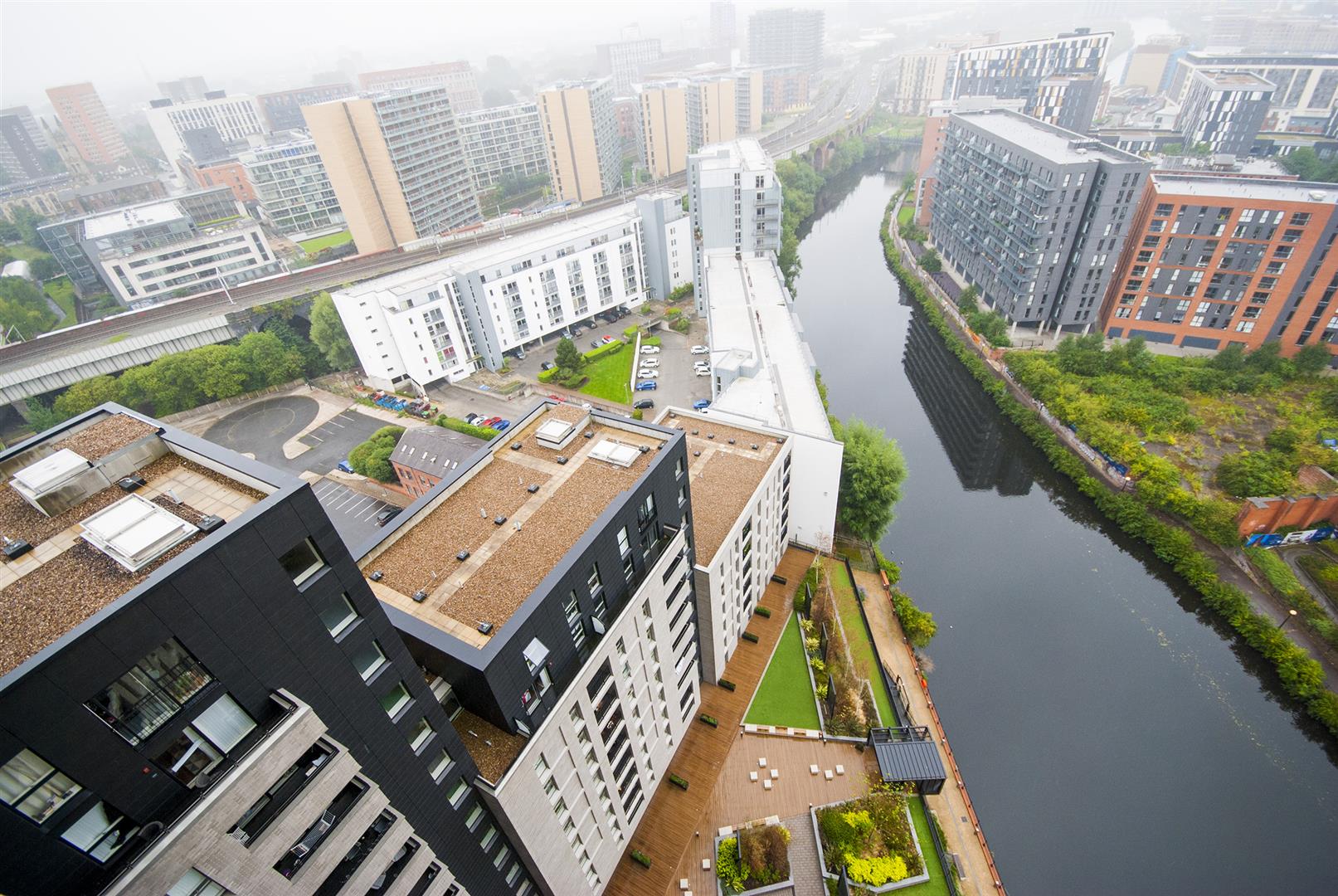 Communal landscaped courtyard set on the banks of the River Irwell.