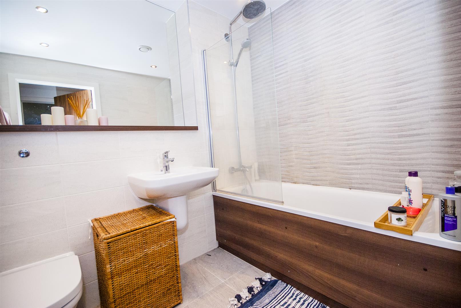 Fully tiled with tiled flooring, heated towel rail, extractor fan and three piece suite in white comprising panel enclosed bath with drench head shower and hand held attachment, low level WC and hand wash basin.