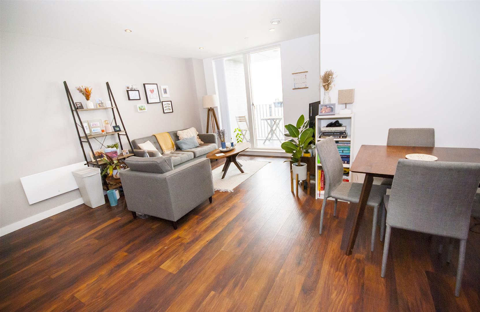 With laminate wood effect flooring, spotlighting, two electric wall heaters, TV point, satellite point, power points and sliding doors overlooking and opening out to the balcony. The Kitchen area features a range of wall and base units with contrasting work surfaces and downlighting, built in electric oven and hob with extractor, inset sink and drainer and integrated fridge freezer.