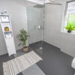 Luxurious contemporary three piece family wet room style bathroom, comprising of a double walk in shower, low level WC and hand wash basin with vanity unit, chrome heated towel, fully tiled walls and inset ceiling spot lights.
