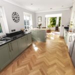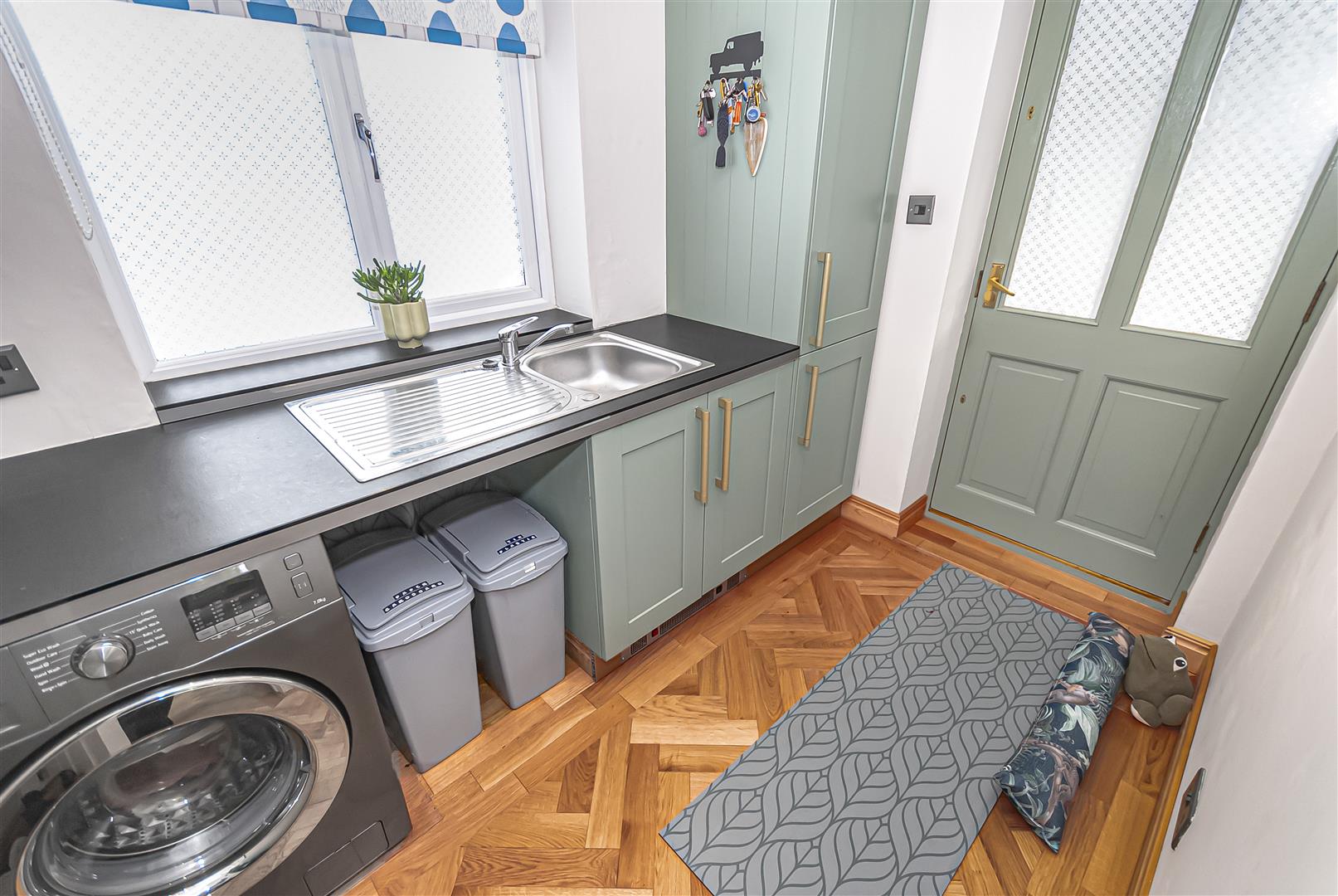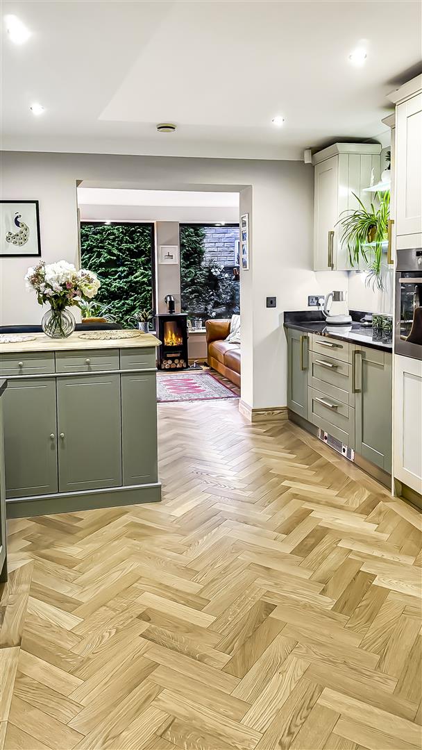 Fitted with a range of contemporary wall and base units with quartz worktops and splashback, inset sink with mixer tap, two integrated fan assisted ovens, space for American fridge freezer, additional wooded topped island with seating for twos, inset spots, wooden Parque flooring. Open plan to the sun room and the utility room.