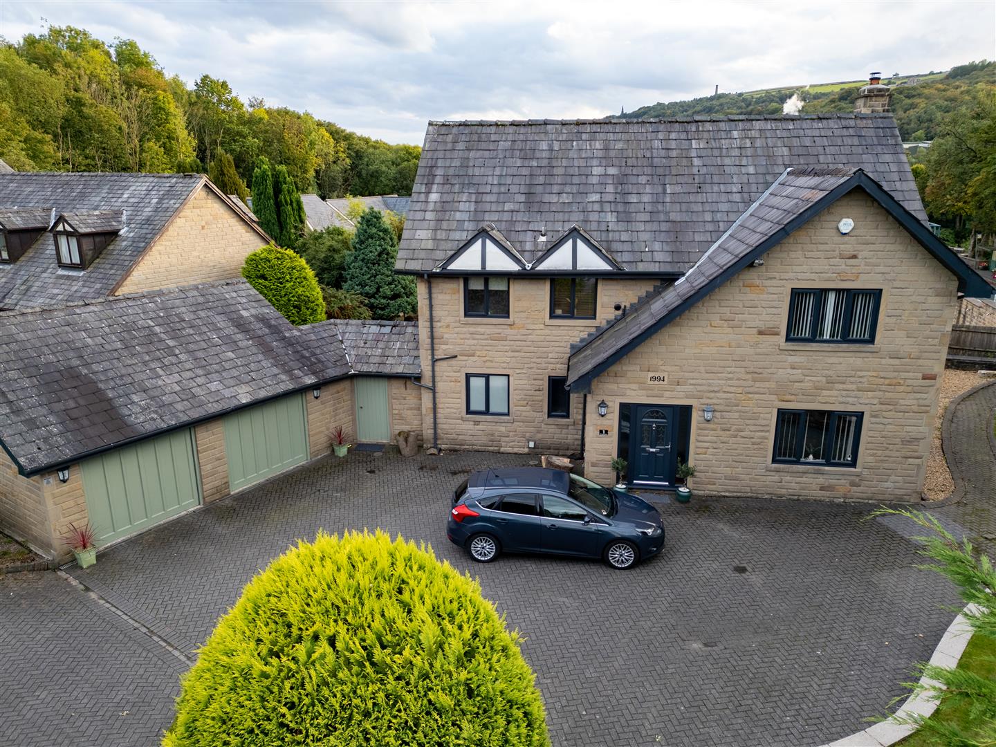Driveway parking for four vehicles and a lawn area with mature shrubs.