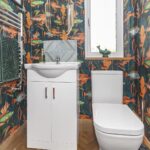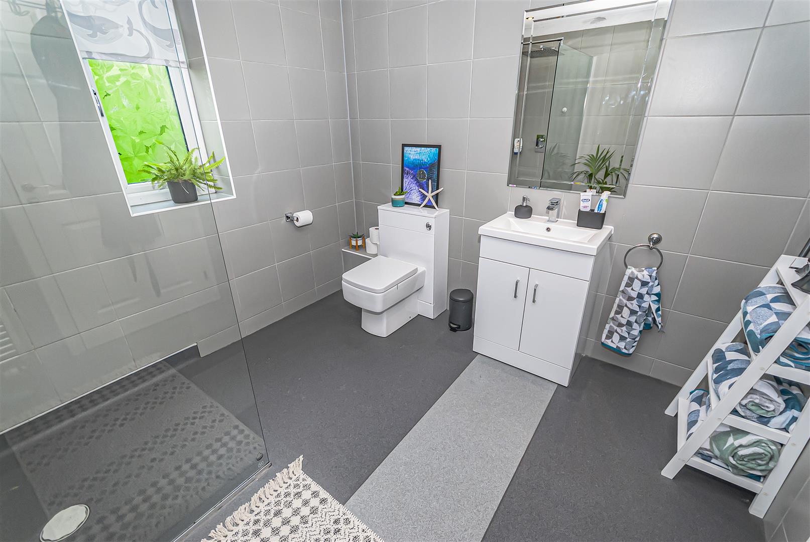 uPVC double glazed frosted window to front elevation, fitted with a contemporary four piece suite comprising of low level WC, hand wash basin, chrome heated towel rail and inset spots.