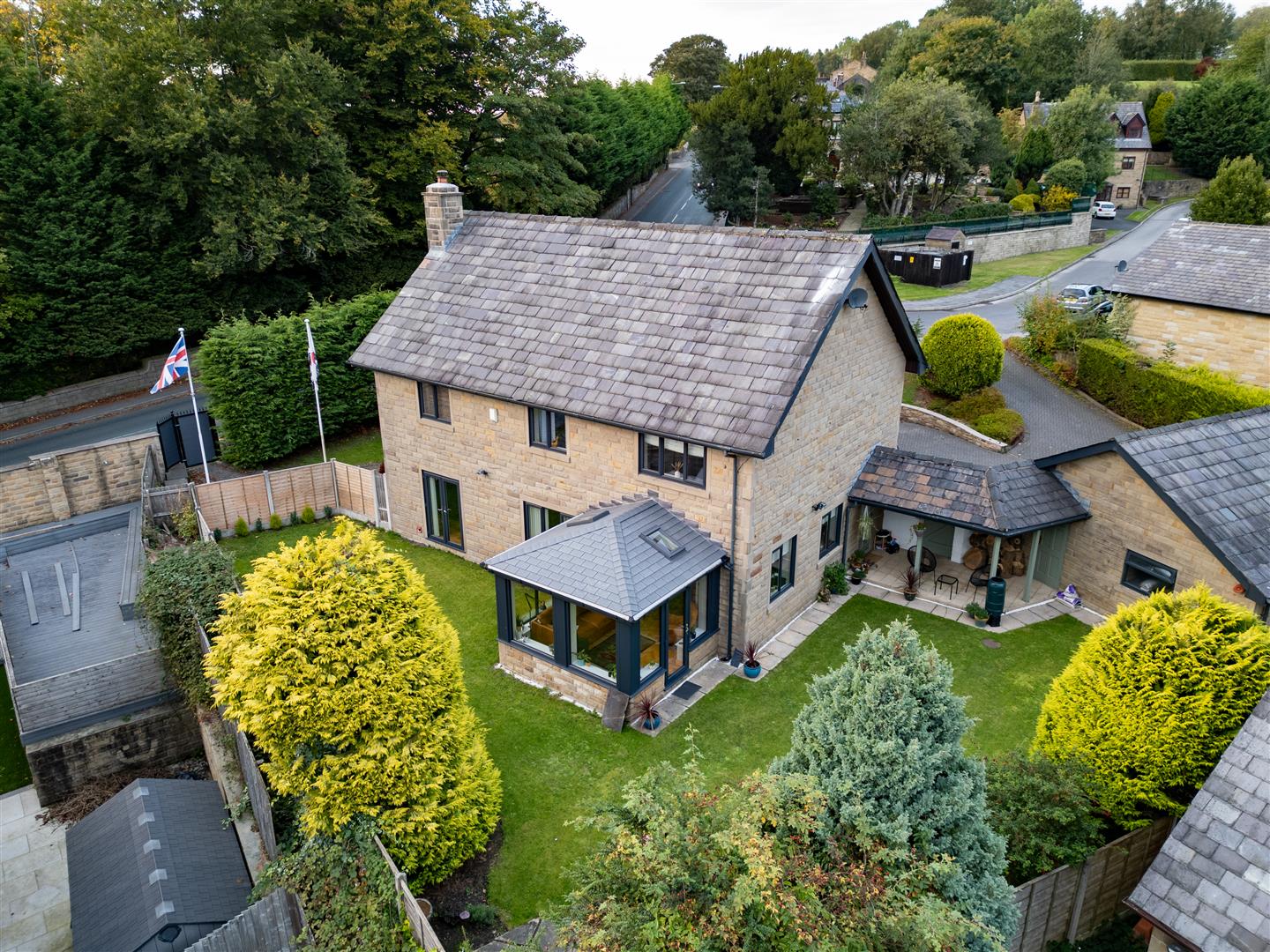 Large rear garden, with patio and lawn areas surrounded with mature shrub borders