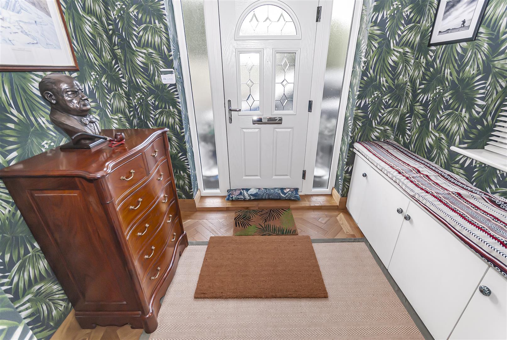 Composite door to front opening into a large, light and airy hallway. With wooden Parque flooring, central ceiling light, ceiling coving and convenient seated storage.