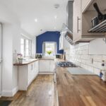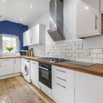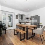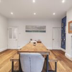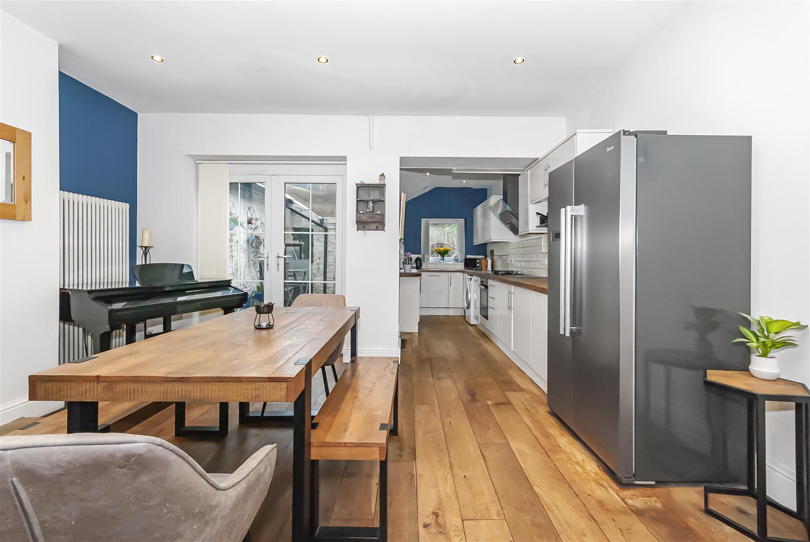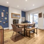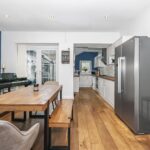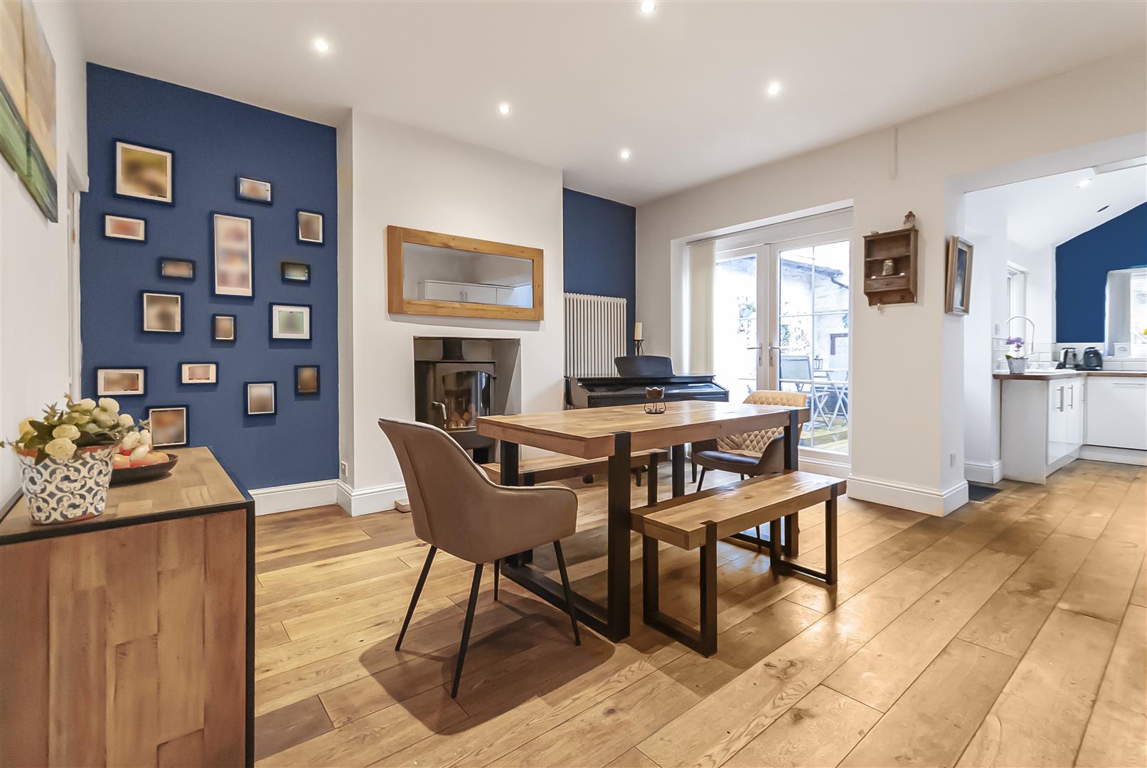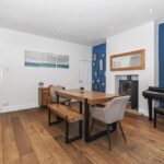 A generous second reception room ideal for family dining and entertaining, with feature fireplace and French doors opening to the rear. Finished with wooden flooring and contemporary styling, this space flows seamlessly through to the kitchen.