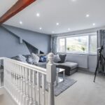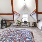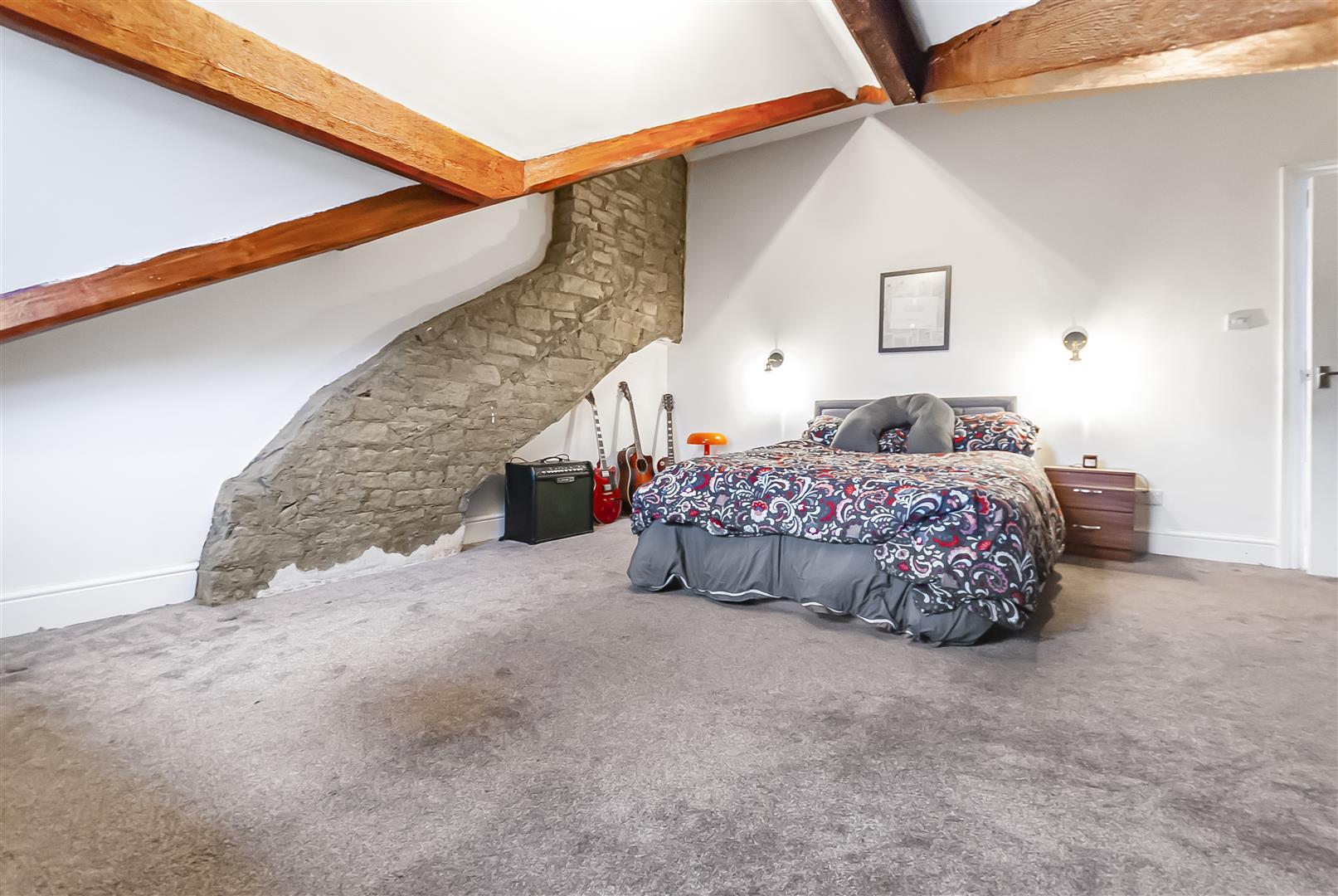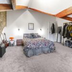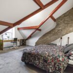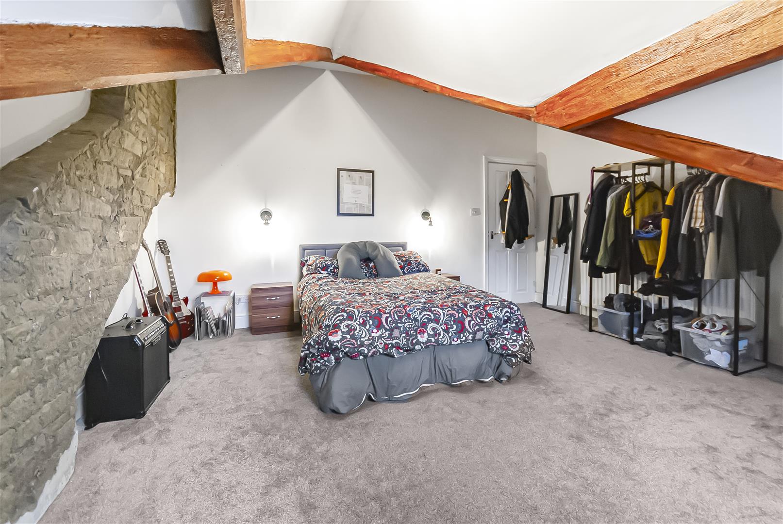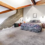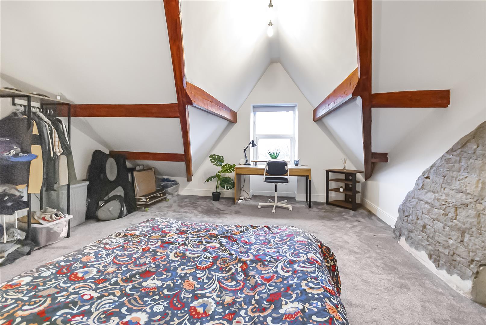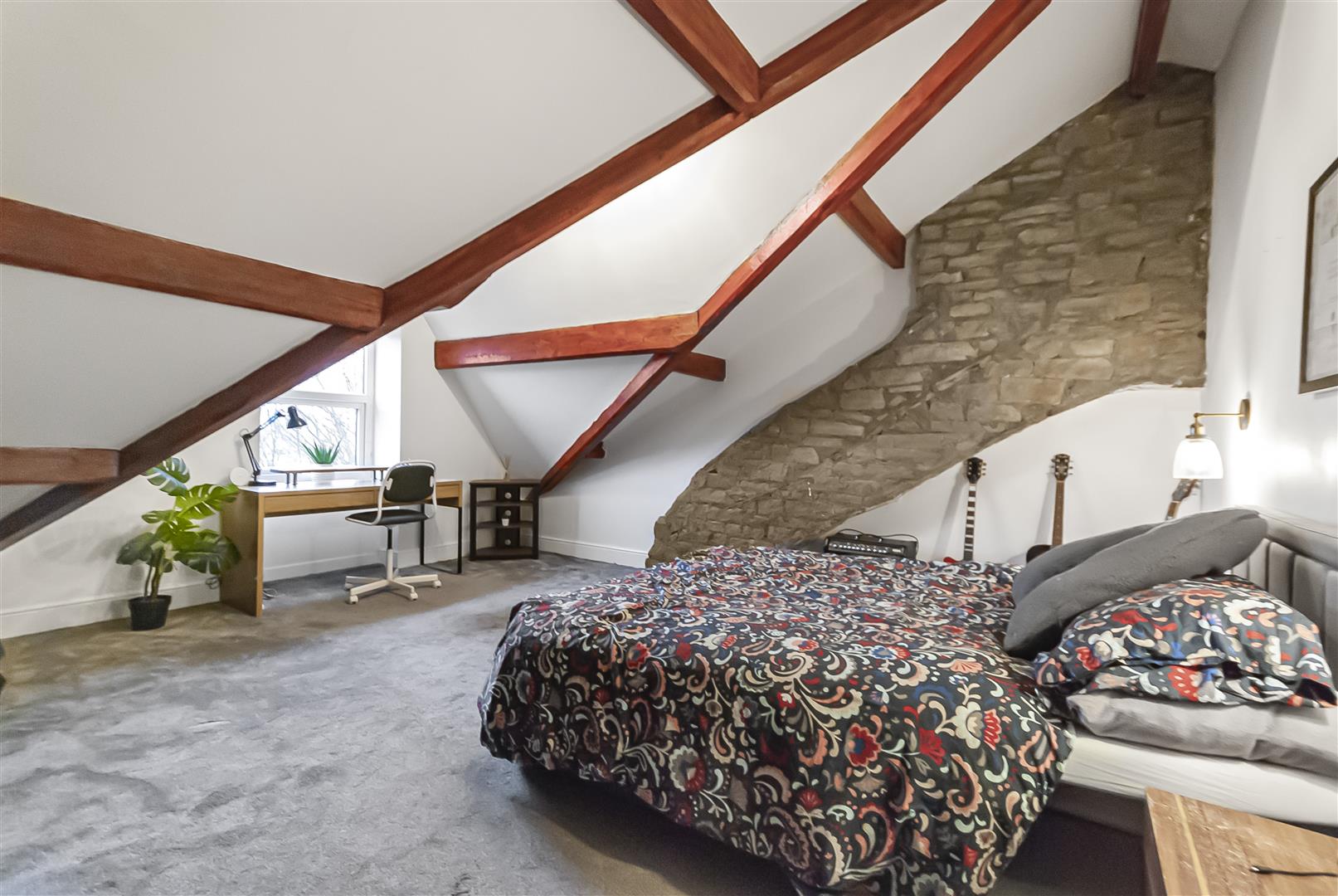 An impressive and characterful top-floor bedroom featuring exposed beams and a striking stone feature wall. This spacious room offers excellent versatility and could serve as a principal suite, guest room or additional living space. Velux-style windows and rear glazing enhance the natural light.