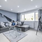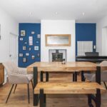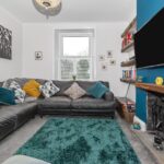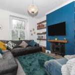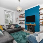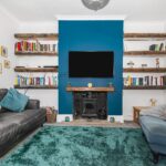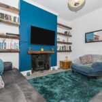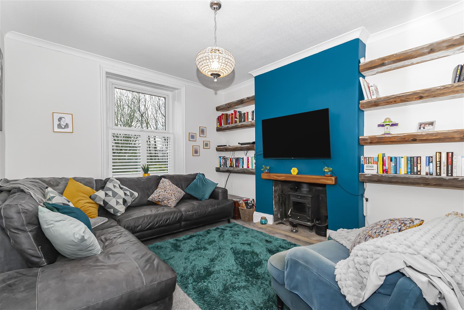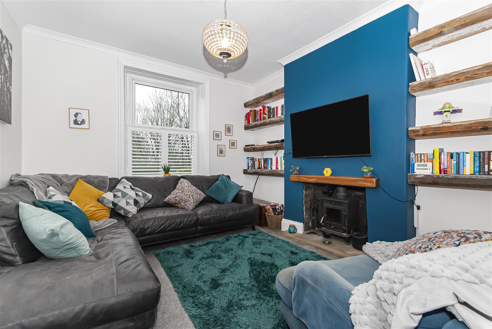 A cosy yet spacious front-facing reception room featuring a character fireplace with wood-burning stove, bespoke shelving and a striking accent wall. A large window provides excellent natural light, creating a warm and inviting living space.