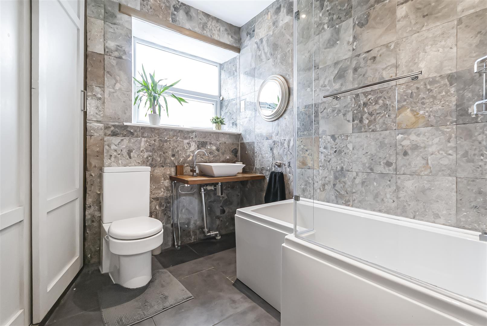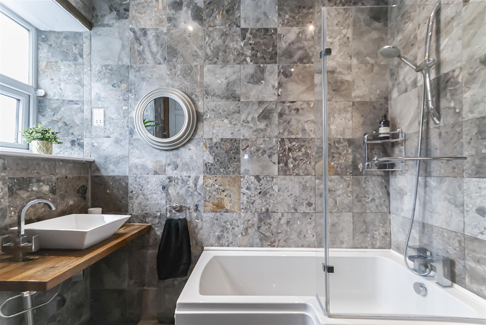 A stylish bathroom fitted with a panelled bath with glass screen and shower over, low-level WC and contemporary wash hand basin set on a wooden vanity shelf. Finished with distinctive tiling and modern fittings.