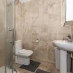 Modern shower room fitted with a walk-in shower enclosure, low-level WC and pedestal wash hand basin, finished with contemporary tiling.