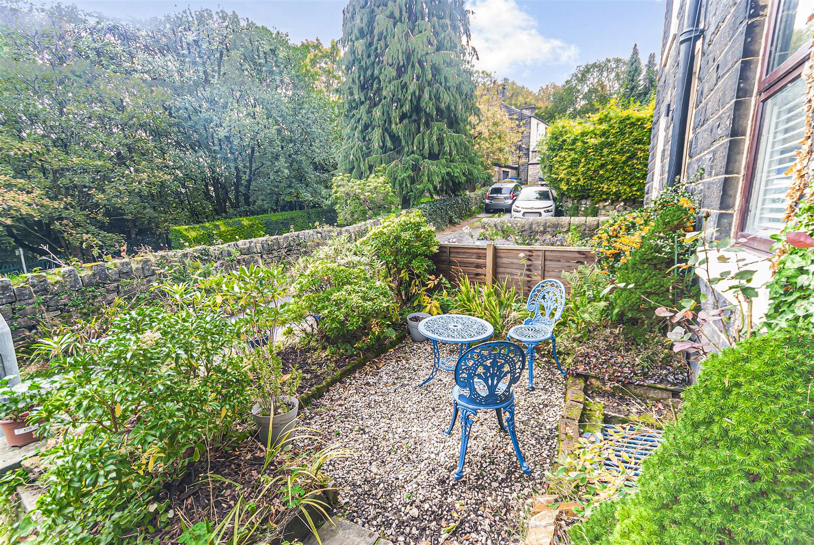 To the front of the property is a charming, low-maintenance garden with mature planting and a gravelled seating area, creating an attractive and welcoming approach. Bordered by stone walling and established greenery, this space offers a pleasant spot to sit and enjoy the surroundings.