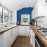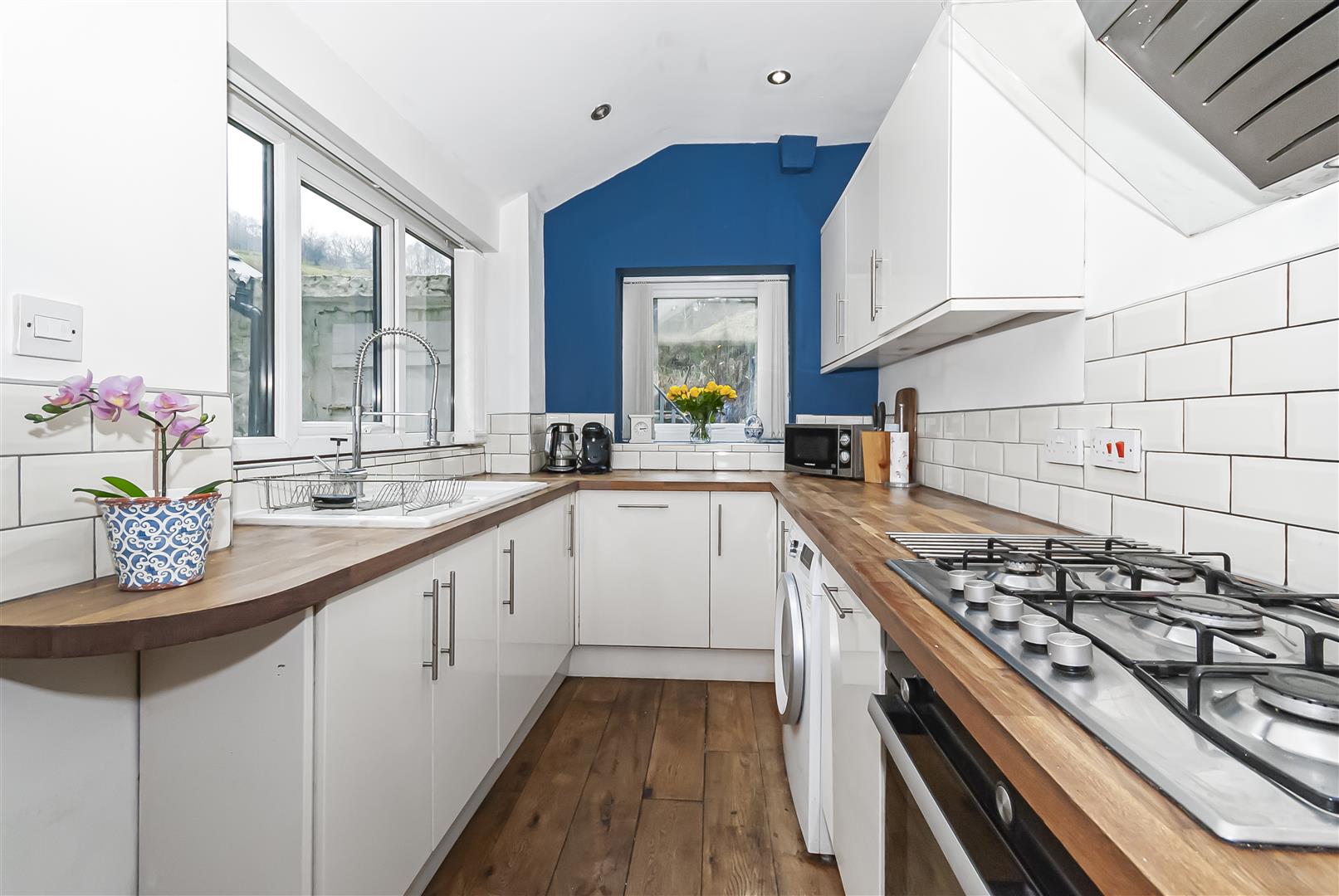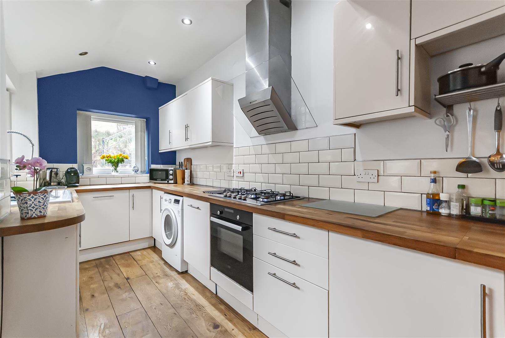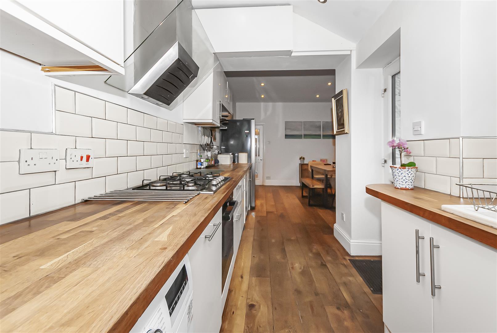 A modern fitted kitchen comprising a range of white wall and base units complemented by solid wooden work surfaces and tiled splashbacks. Integrated oven with gas hob and extractor above, ceramic sink with drainer and mixer tap, and space for additional appliances. Window to the rear and access out to the garden.