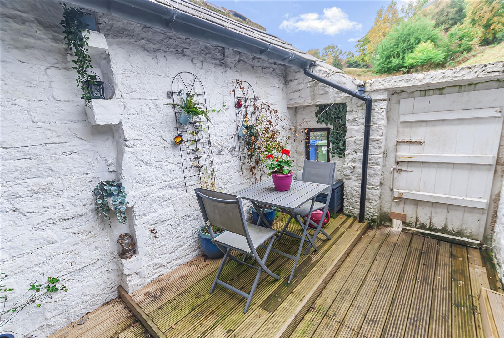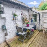 Immediately to the rear of the house is an enclosed courtyard with timber decking, providing an ideal space for outdoor dining and entertaining. Surrounded by whitewashed stone walls, this sheltered area is both private and characterful, with gated access to the rear garden beyond.