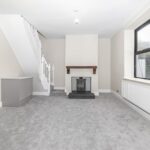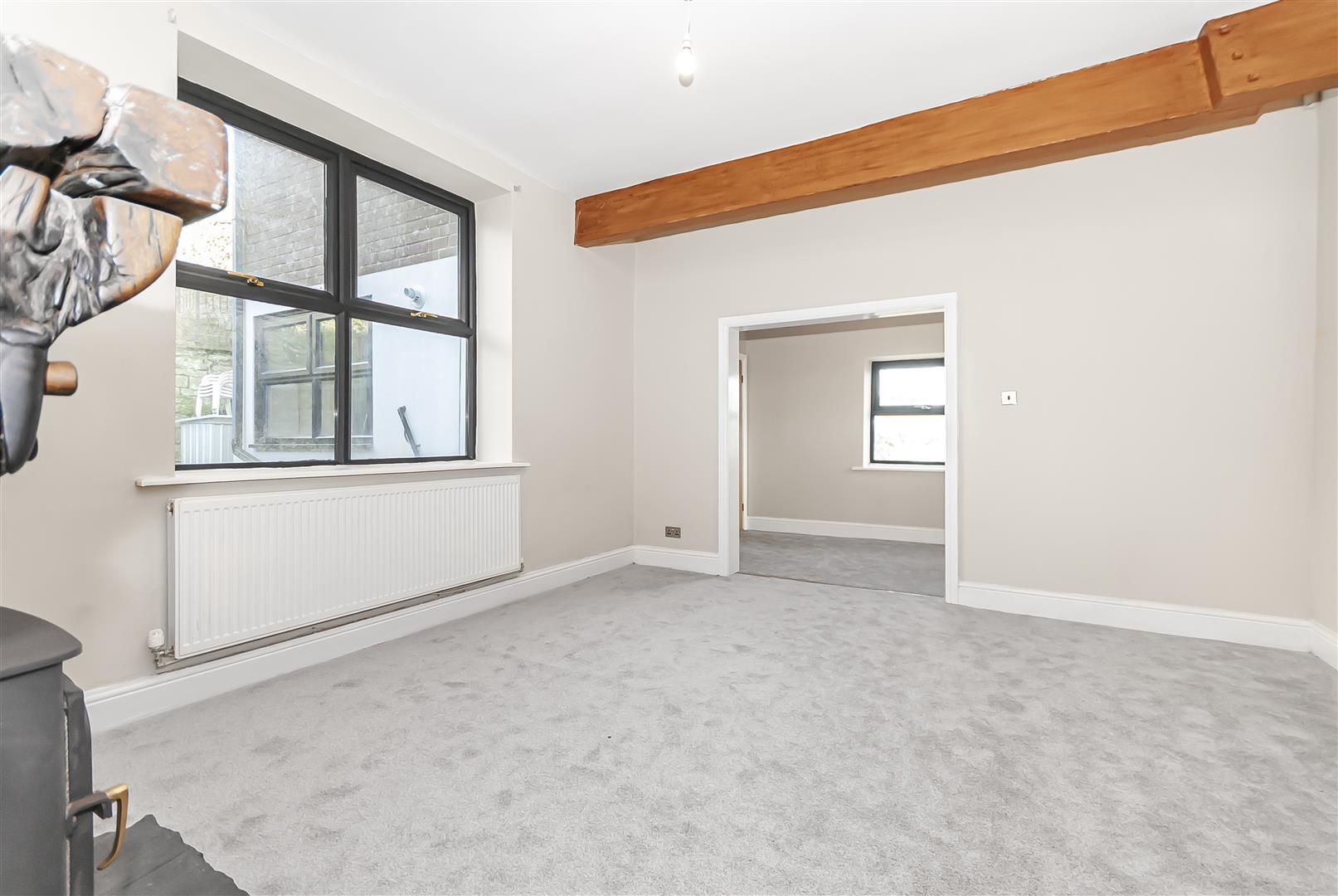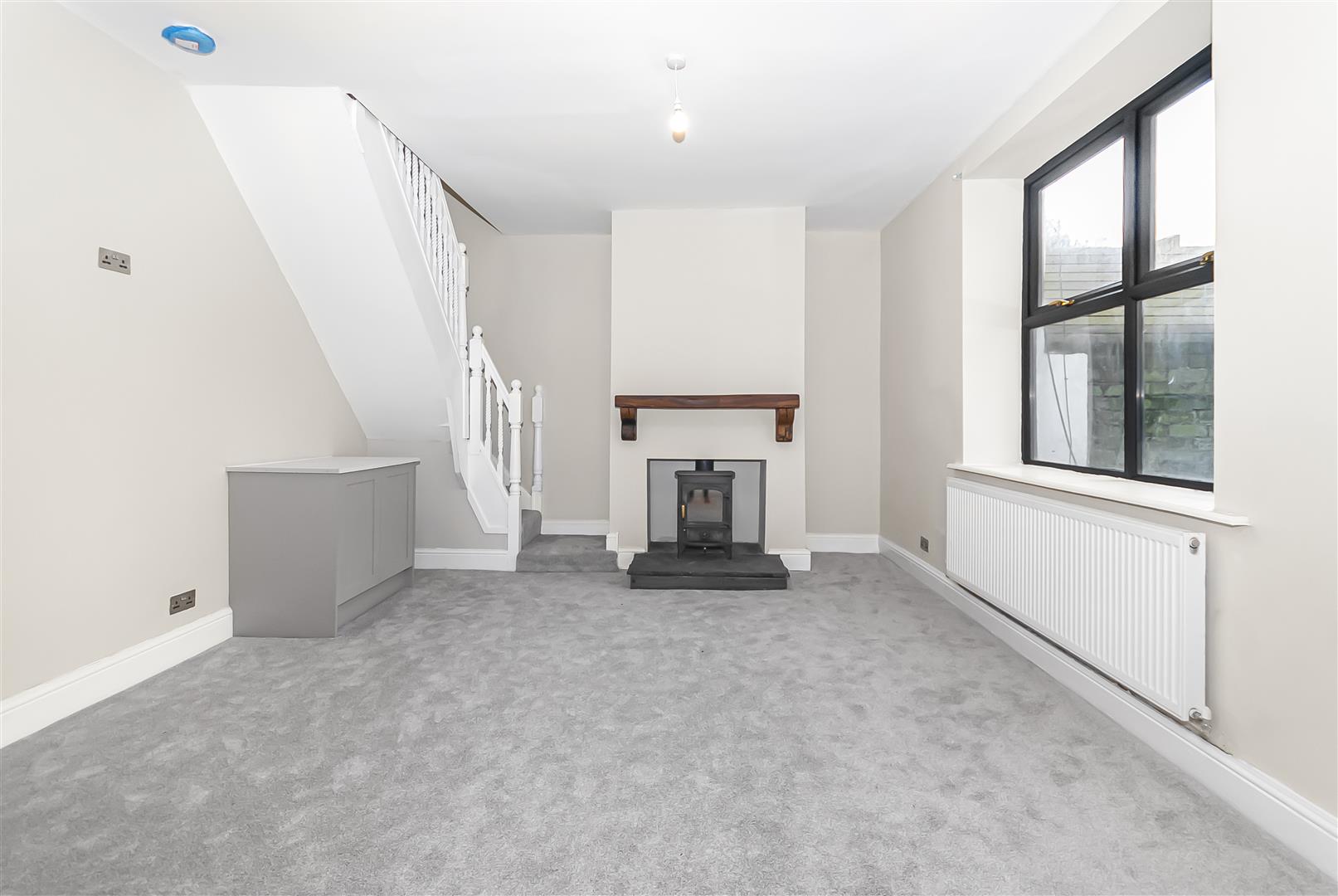 A bright and spacious reception room featuring a charming log-burning stove with timber mantle, creating a focal point to the room. Large window provides natural light, with ample space for lounge furnishings.