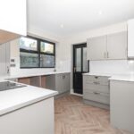 Modern fitted kitchen with a range of wall and base units, complementary work surfaces and integrated oven, hob and extractor. Stylish herringbone flooring and ample workspace make this a practical yet attractive space.