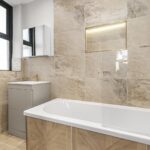 Contemporary bathroom fitted with a three-piece suite including bath with overhead shower, vanity unit and WC. Finished with modern tiling and quality fittings.