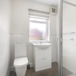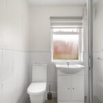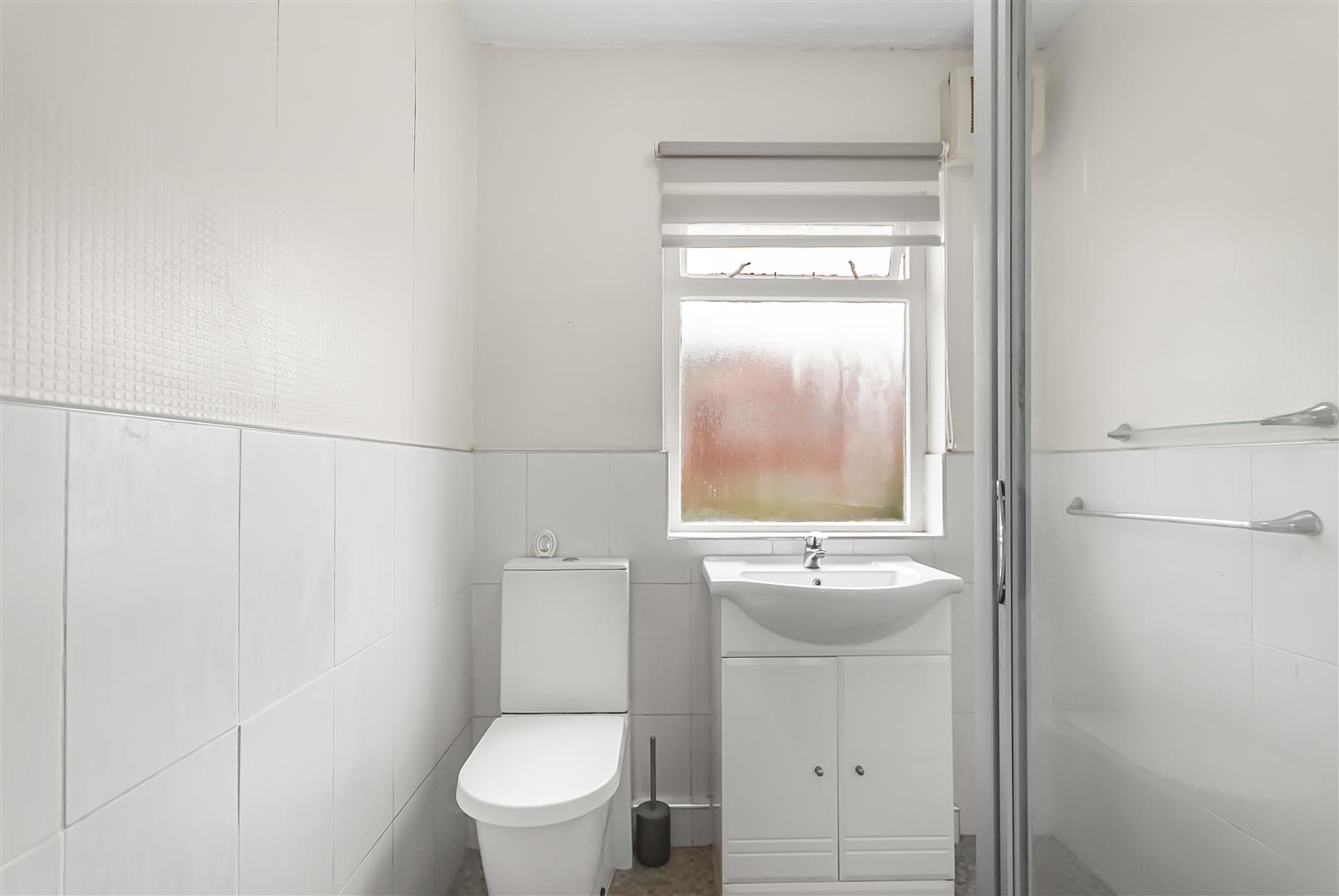 Wooden frame double glazed frosted window rear elevation. Three piece suite comprising of low level WC, wash hand basin, shower with thermostatic shower and glass surround screen, part tiled.