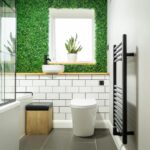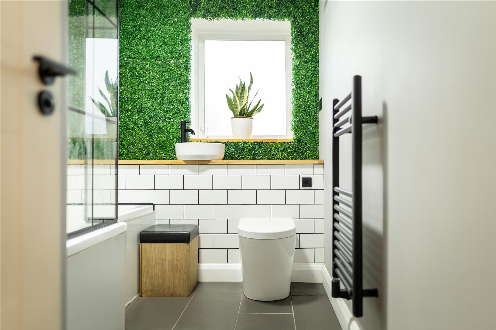 With a side facing opaque UPVC double glazed window, tiled flooring, feature plant living wall, heated towel rail, storage cupboard housing water heater and three piece bathroom suite comprising P shaped bath with waterfall shower over and hand held attachment and screen, low flush WC and hand wash basin.