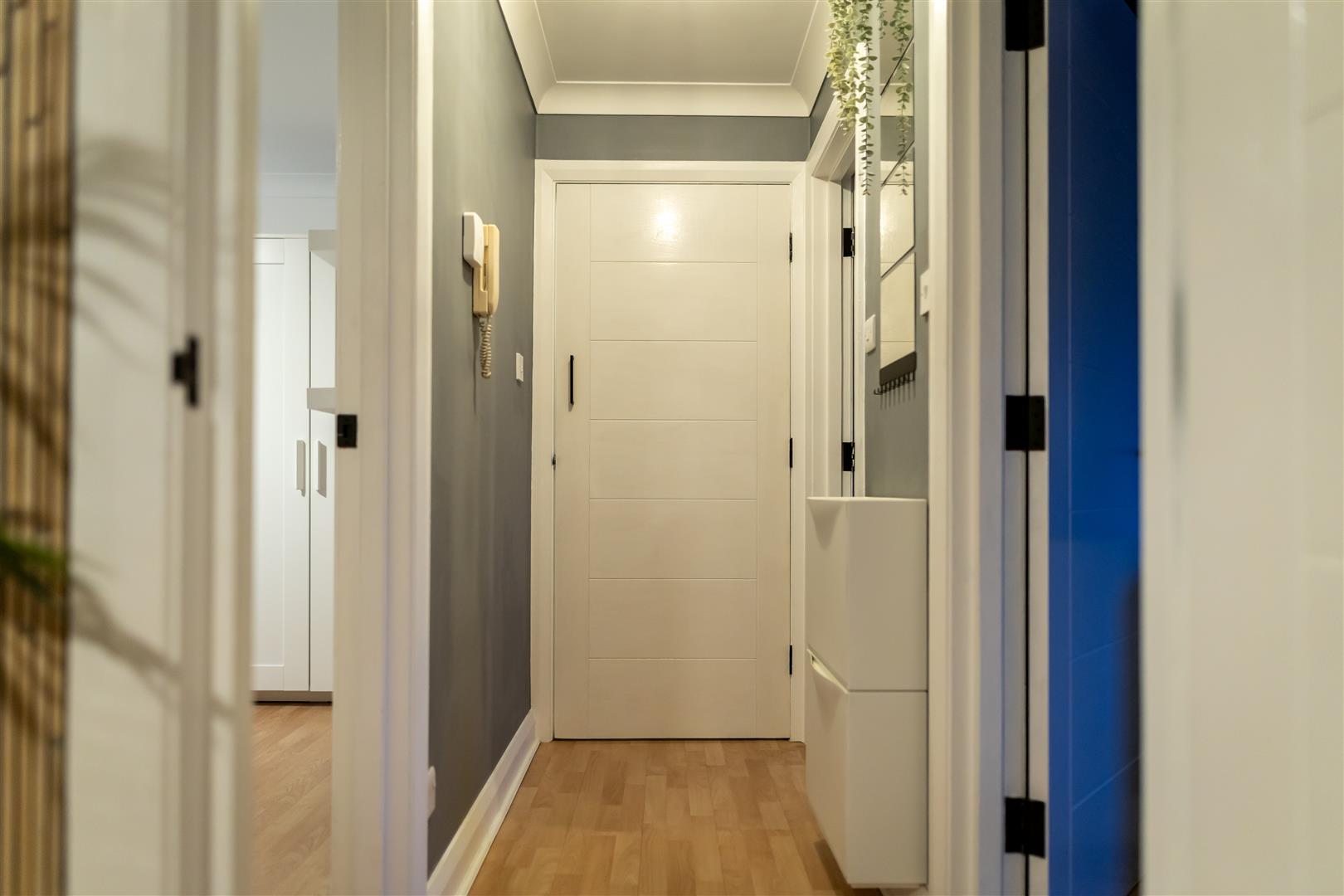 With laminate wood effect flooring, intercom entry phone, power points and pull down ladder leading to the loft space.
